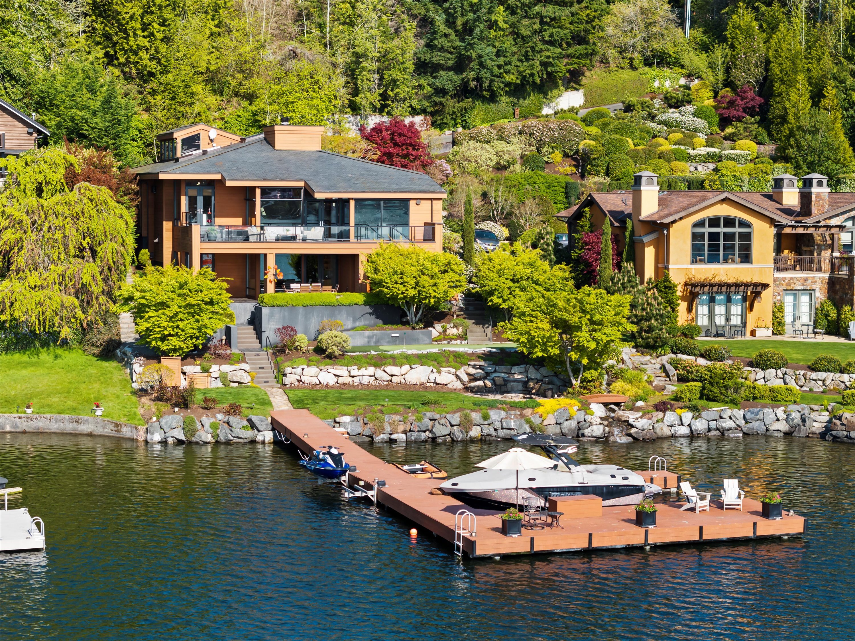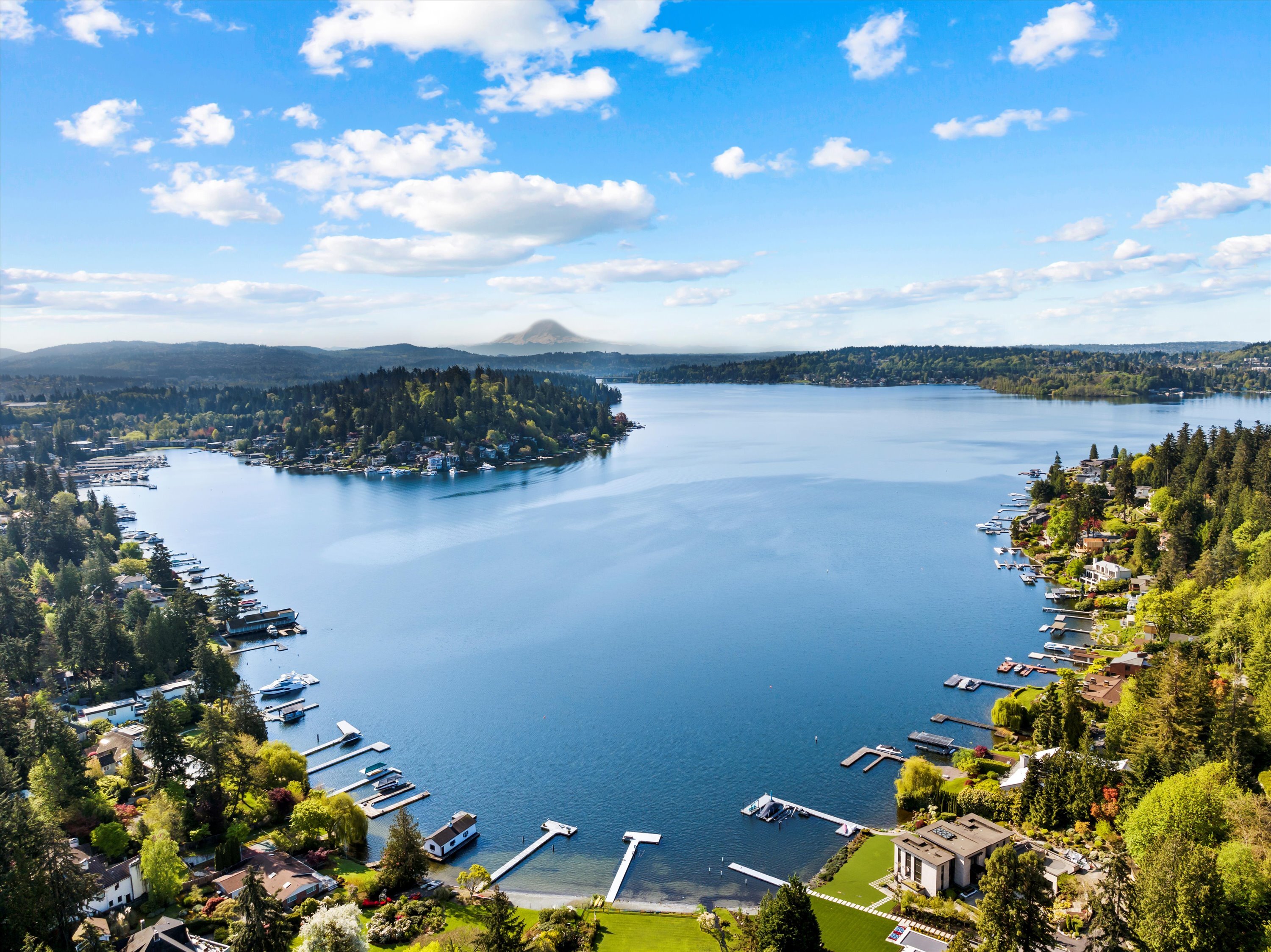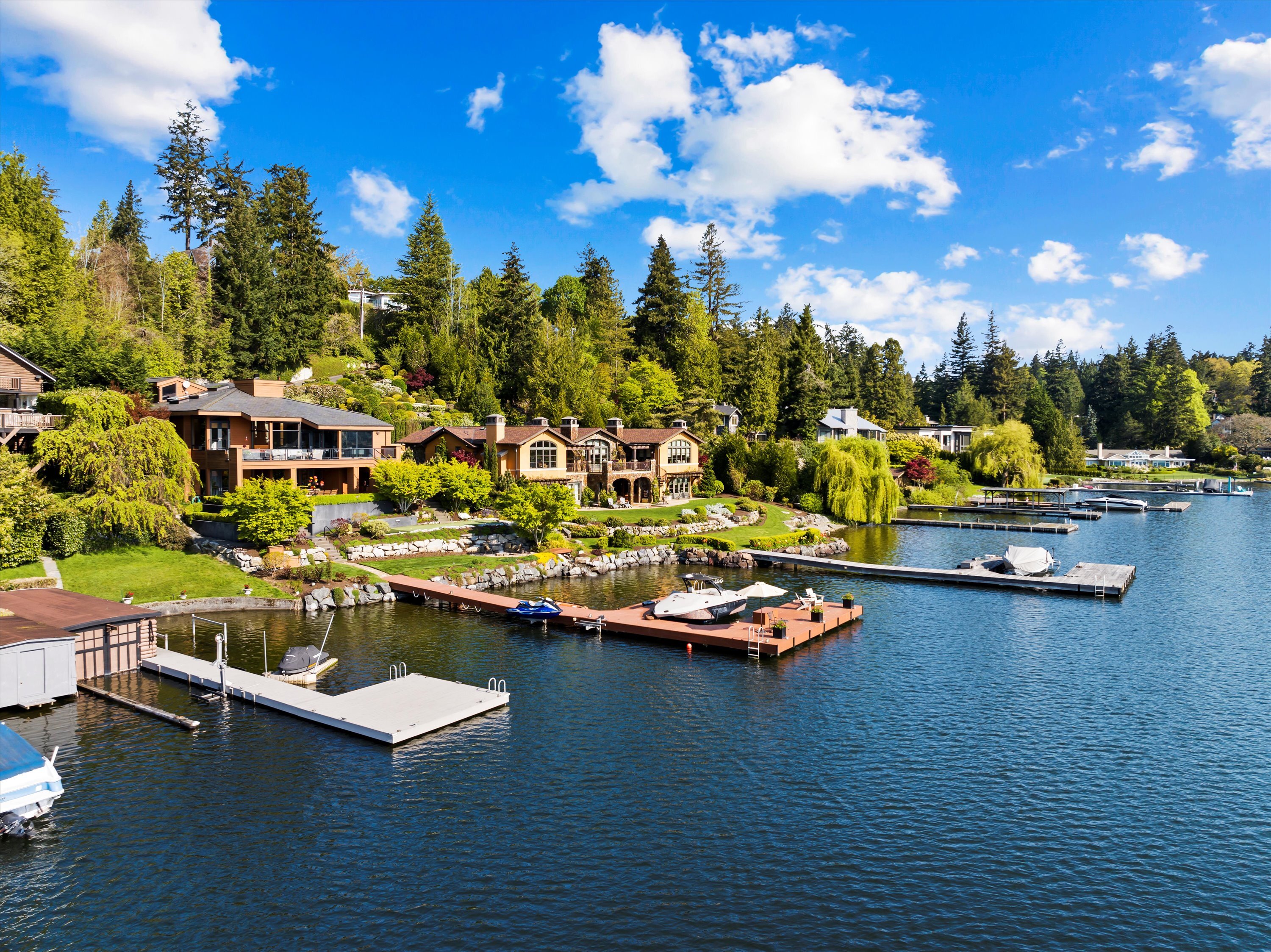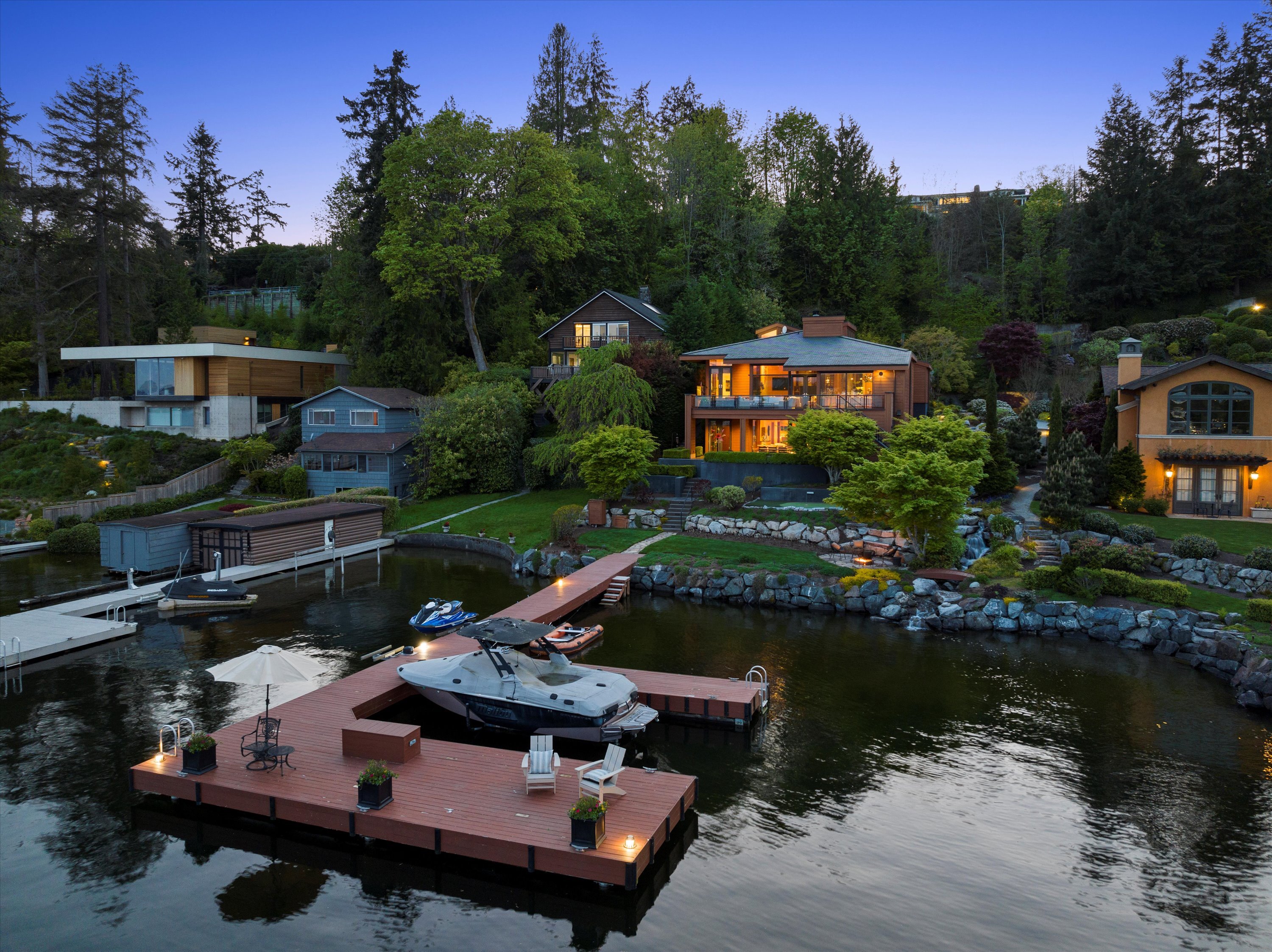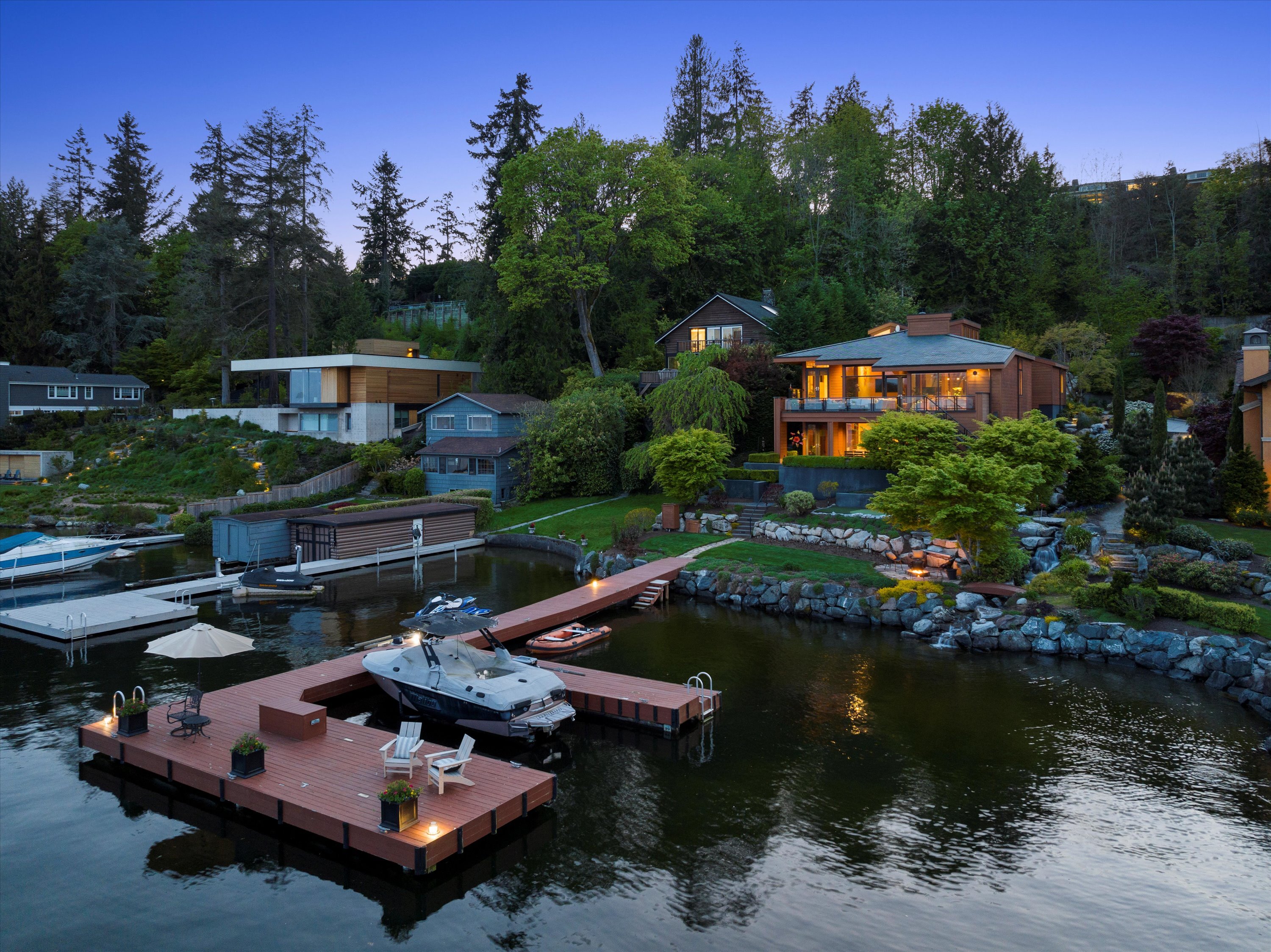 Exceptional Meydenbauer Bay south-facing waterfront work of art! Captivating views of Mt Rainier, Bellevue & the glistening waters of Lk WA. Architectural masterpiece w/cedar ceilings, walls of windows & open, light-filled floorplan. 5,580SF w/5BRs & 4BAs & view deck perfect for entertaining. Chef’s island kitchen open to living areas - all w/ exceptional lake views. Primary w/deck & spa. 2nd kitchen, wine cellar, sauna, work/flex rm & patio w/built-in BBQ. Lush grounds w/incredible waterfall, lakeside firepit & putting green. 87’ dock w/multiple lifts. A+ location 2 mins to downtown Bellevue, parks & top rated schools. Curated for effortless living & unforgettable moments, a truly extraordinary retreat where waterfront dreams are realized!