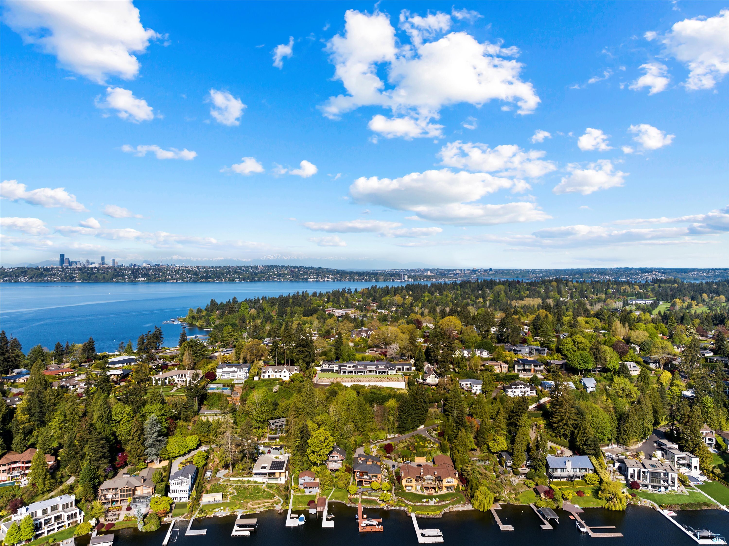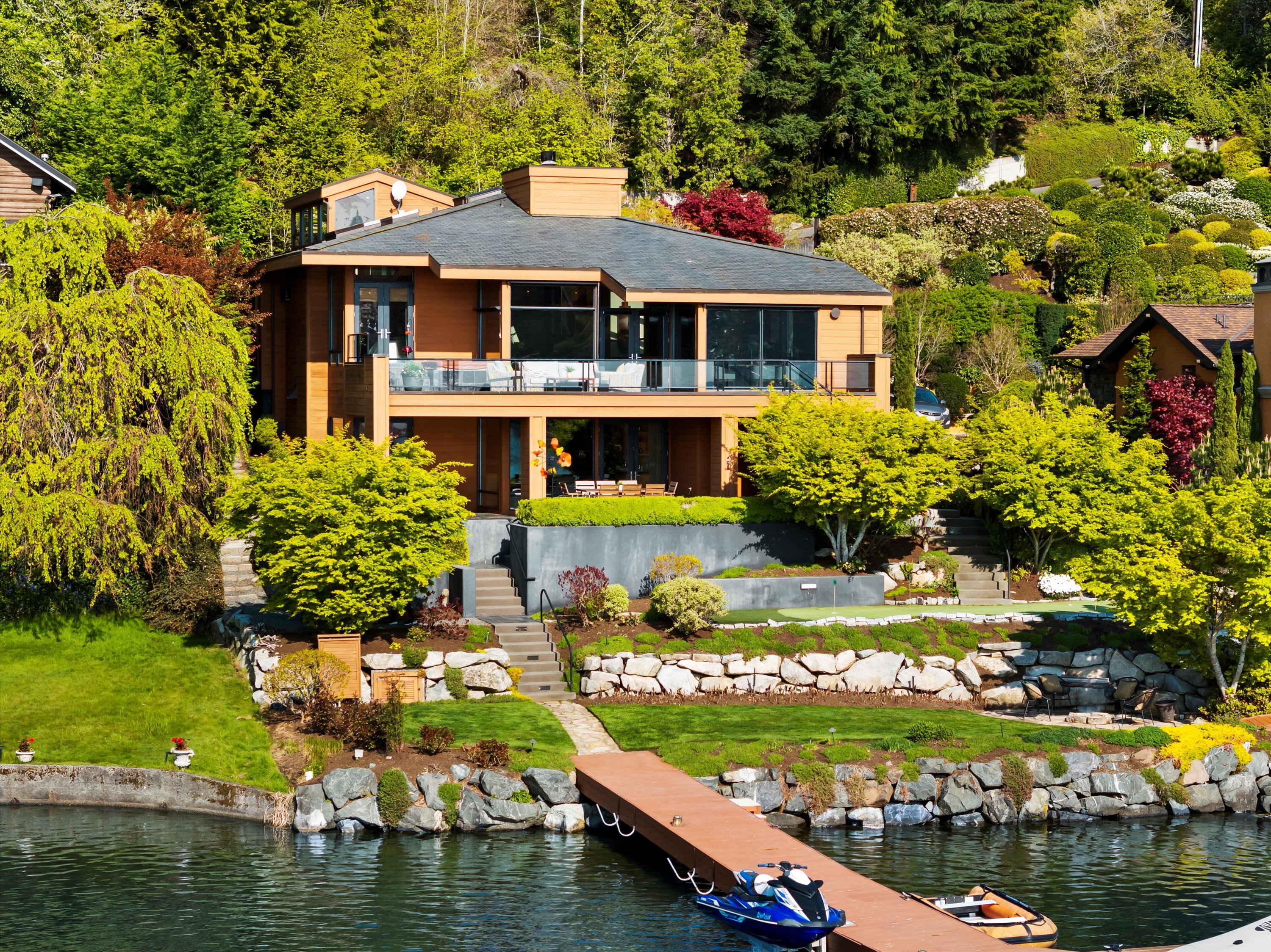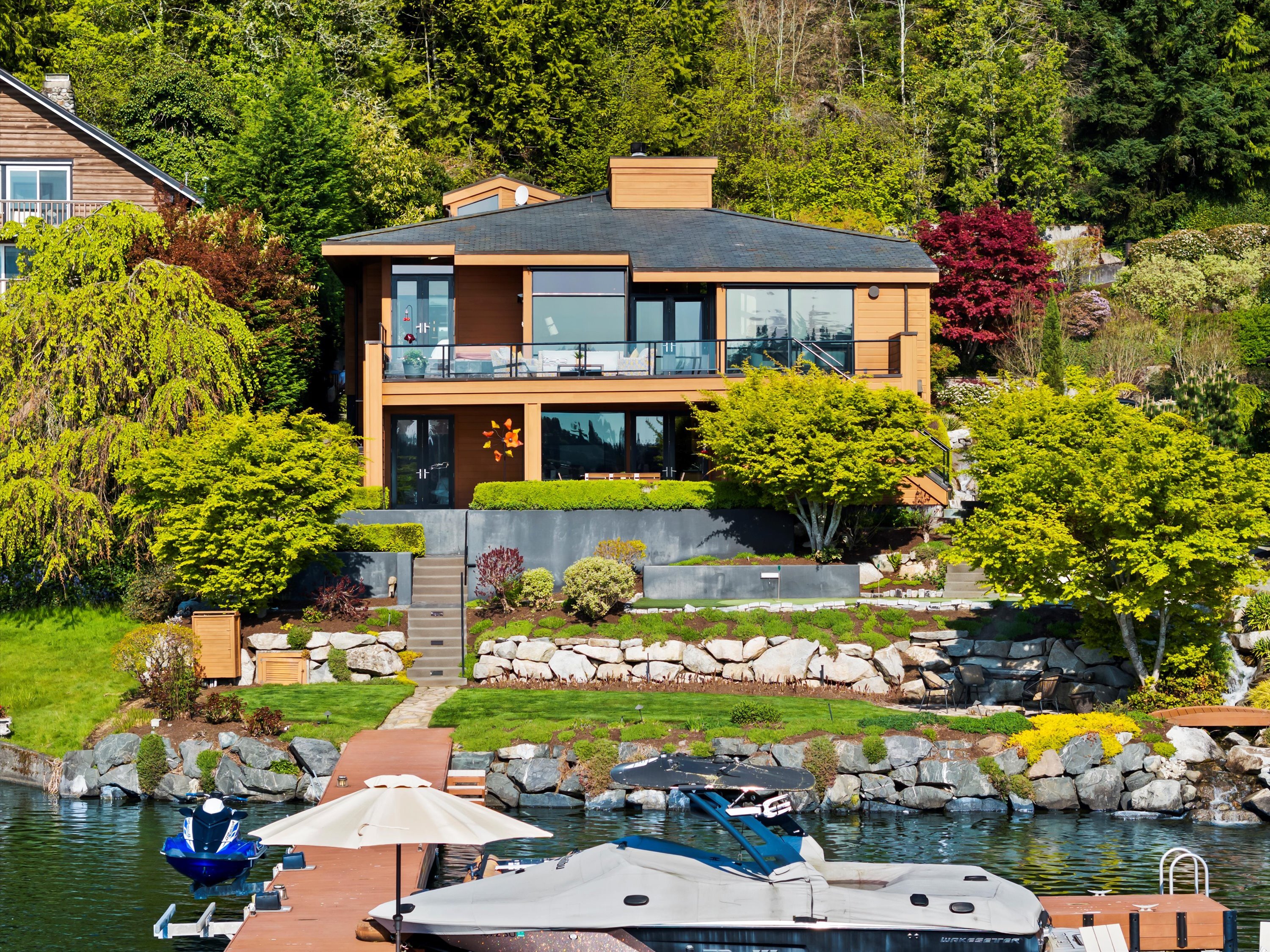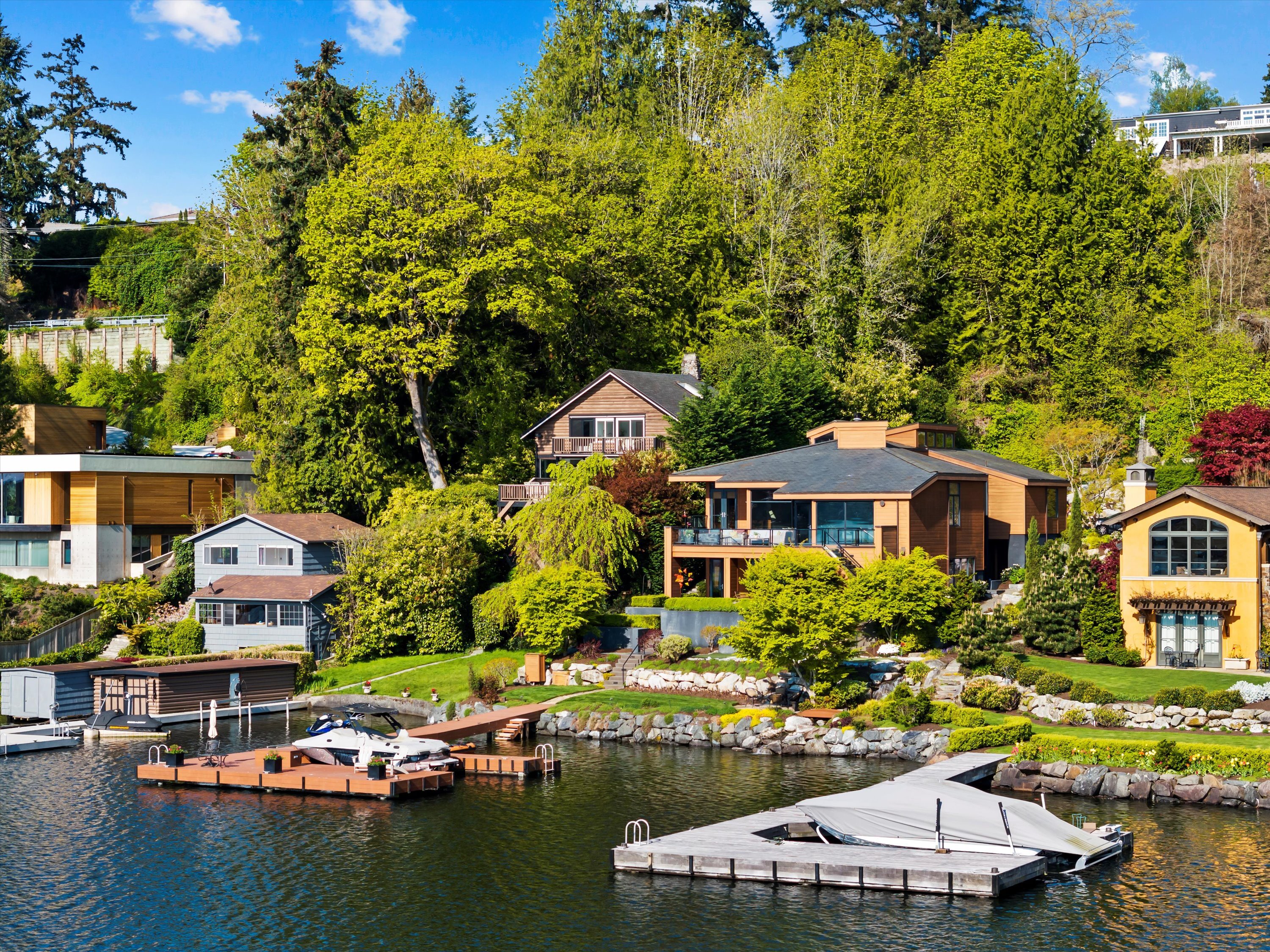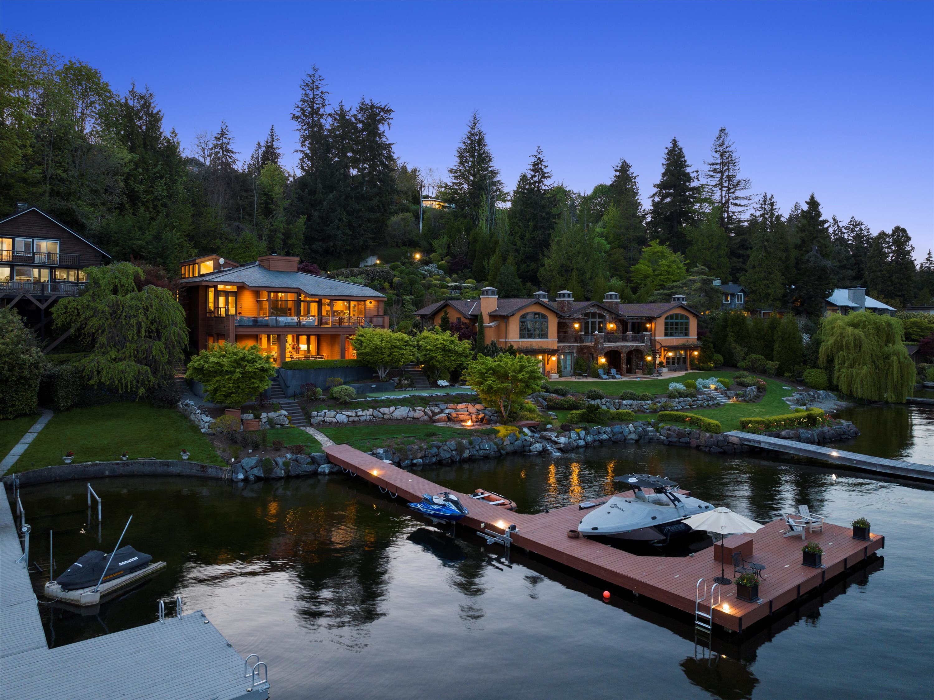 Exceptional Meydenbauer Bay south-facing waterfront work of art! Captivating views of Mt Rainier, Bellevue & the glistening waters of Lk WA. Architectural masterpiece w/cedar ceilings, walls of windows & open, light-filled floorplan. 5,580SF w/5BRs & 4BAs & view deck perfect for entertaining. Chef’s island kitchen open to living areas - all w/ exceptional lake views. Primary w/deck & spa. 2nd kitchen, wine cellar, sauna, work/flex rm & patio w/built-in BBQ. Lush grounds w/incredible waterfall, lakeside firepit & putting green. 87’ dock w/multiple lifts. A+ location 2 mins to downtown Bellevue, parks & top rated schools. Curated for effortless living & unforgettable moments, a truly extraordinary retreat where waterfront dreams are realized!