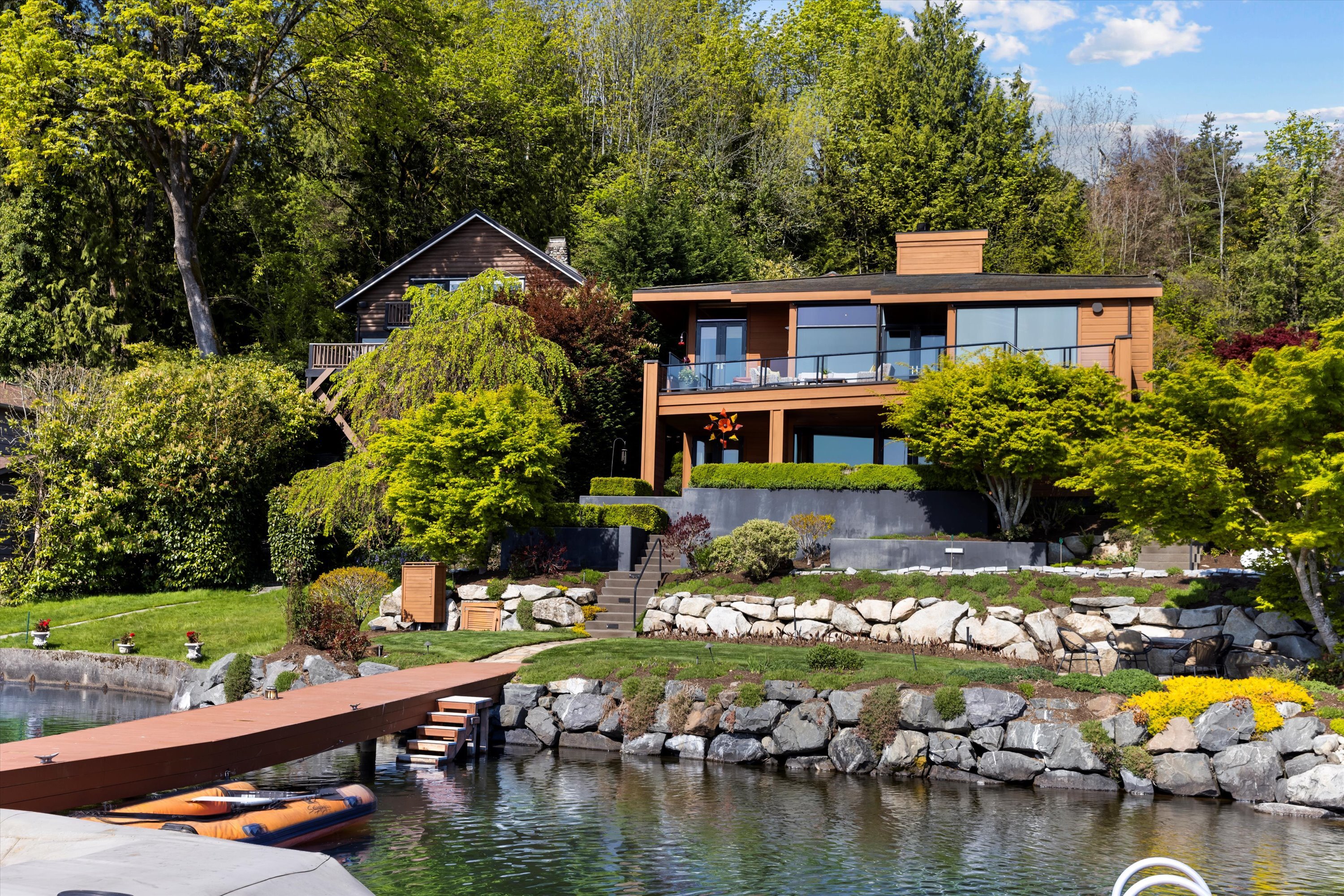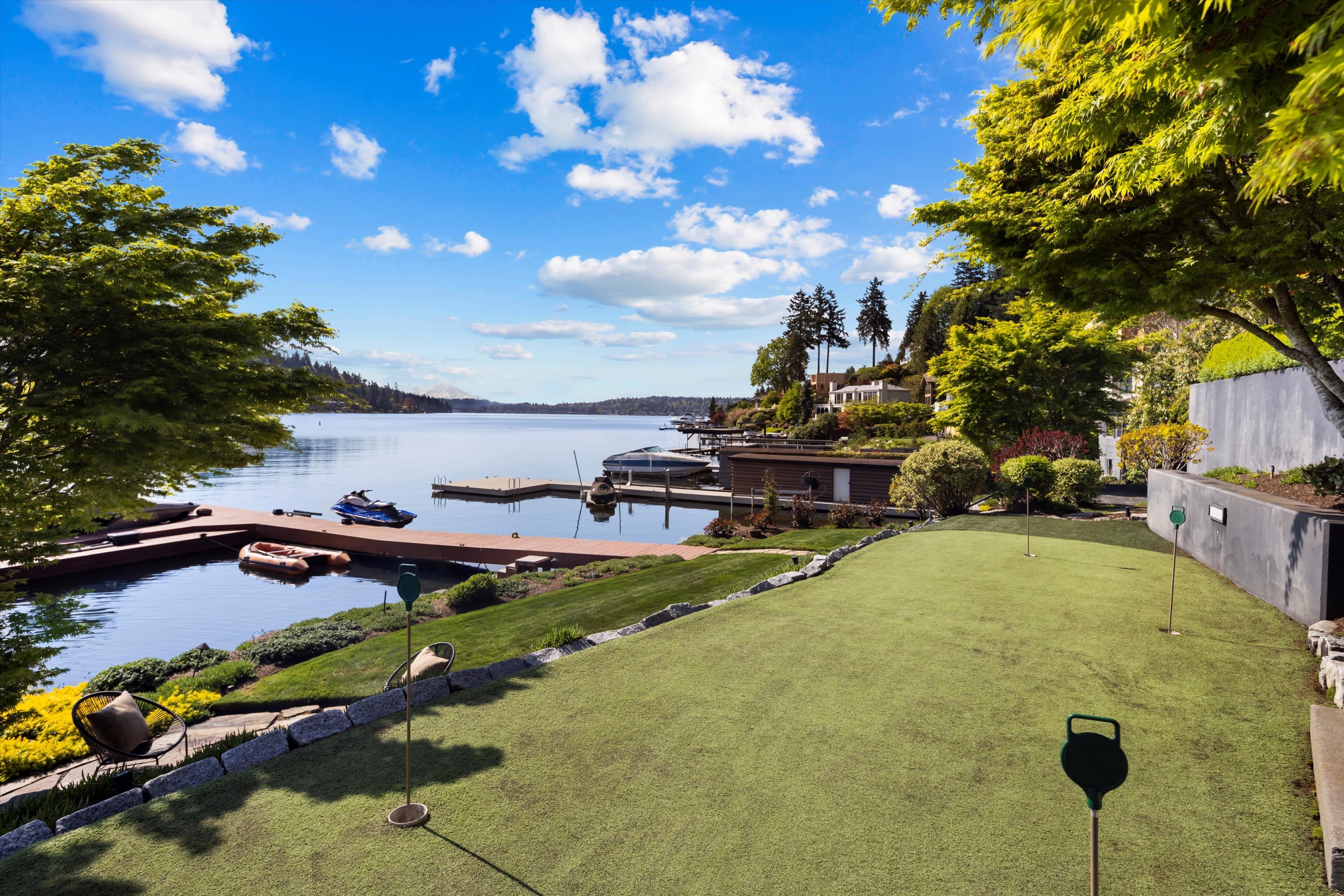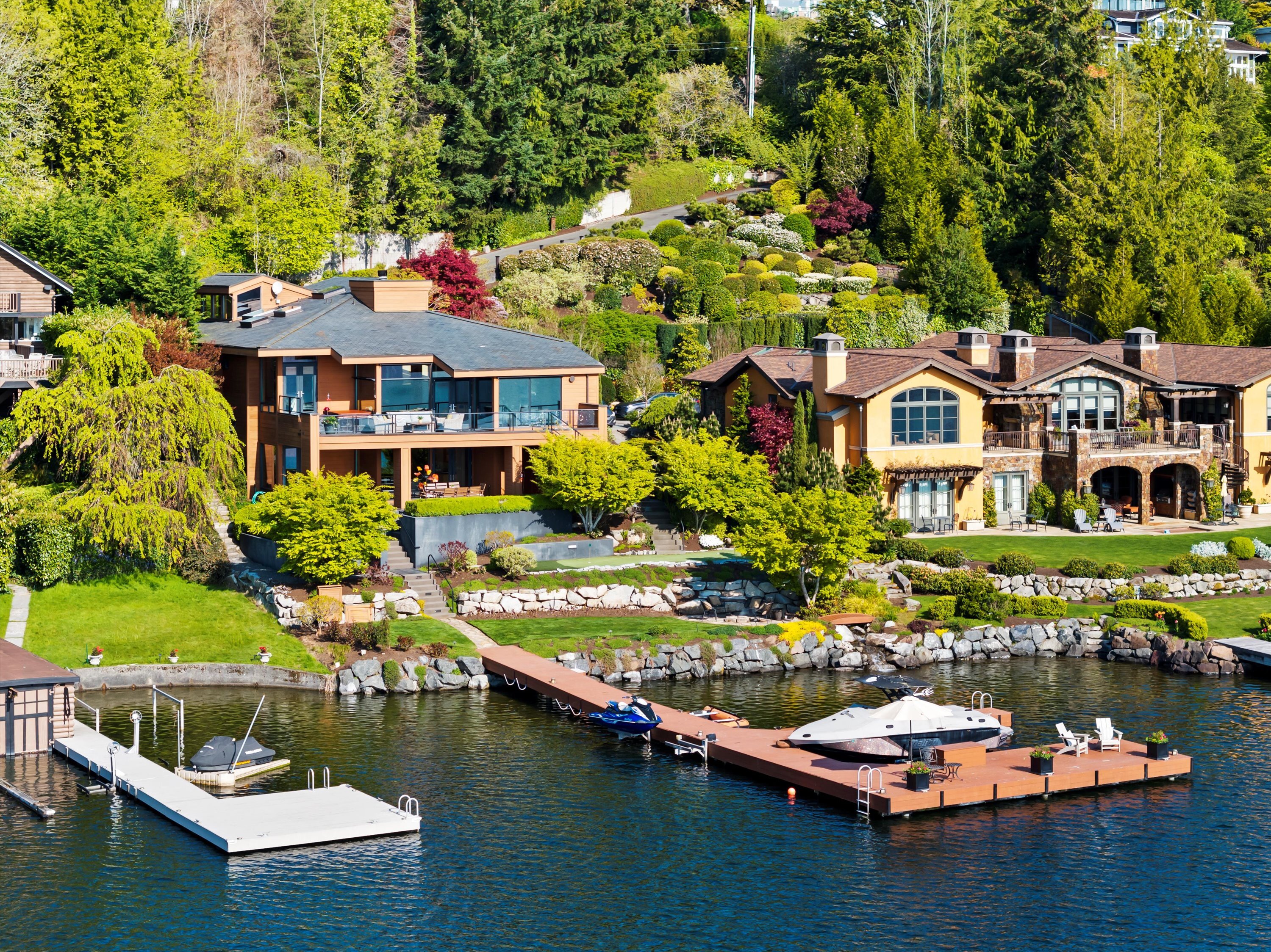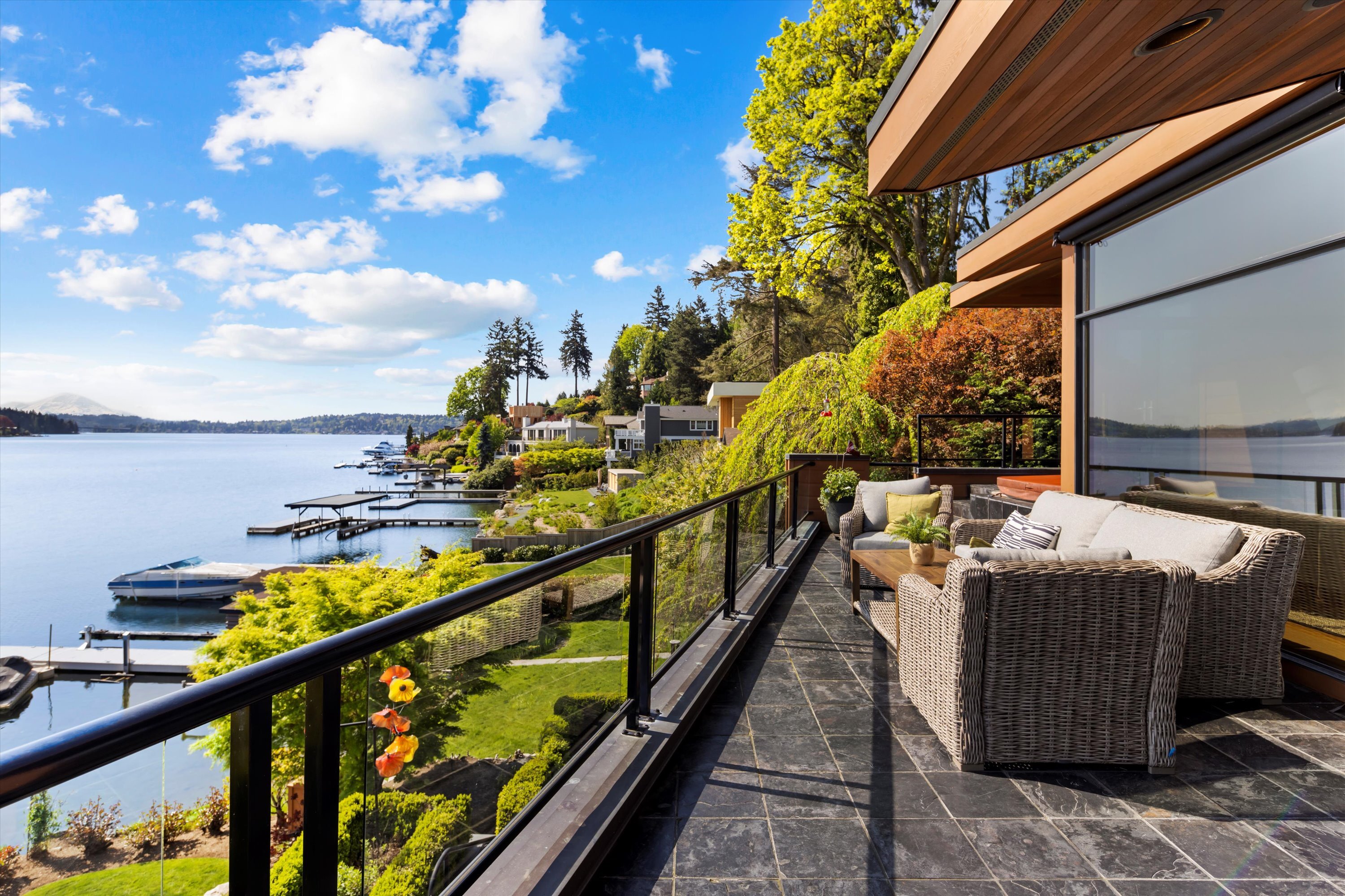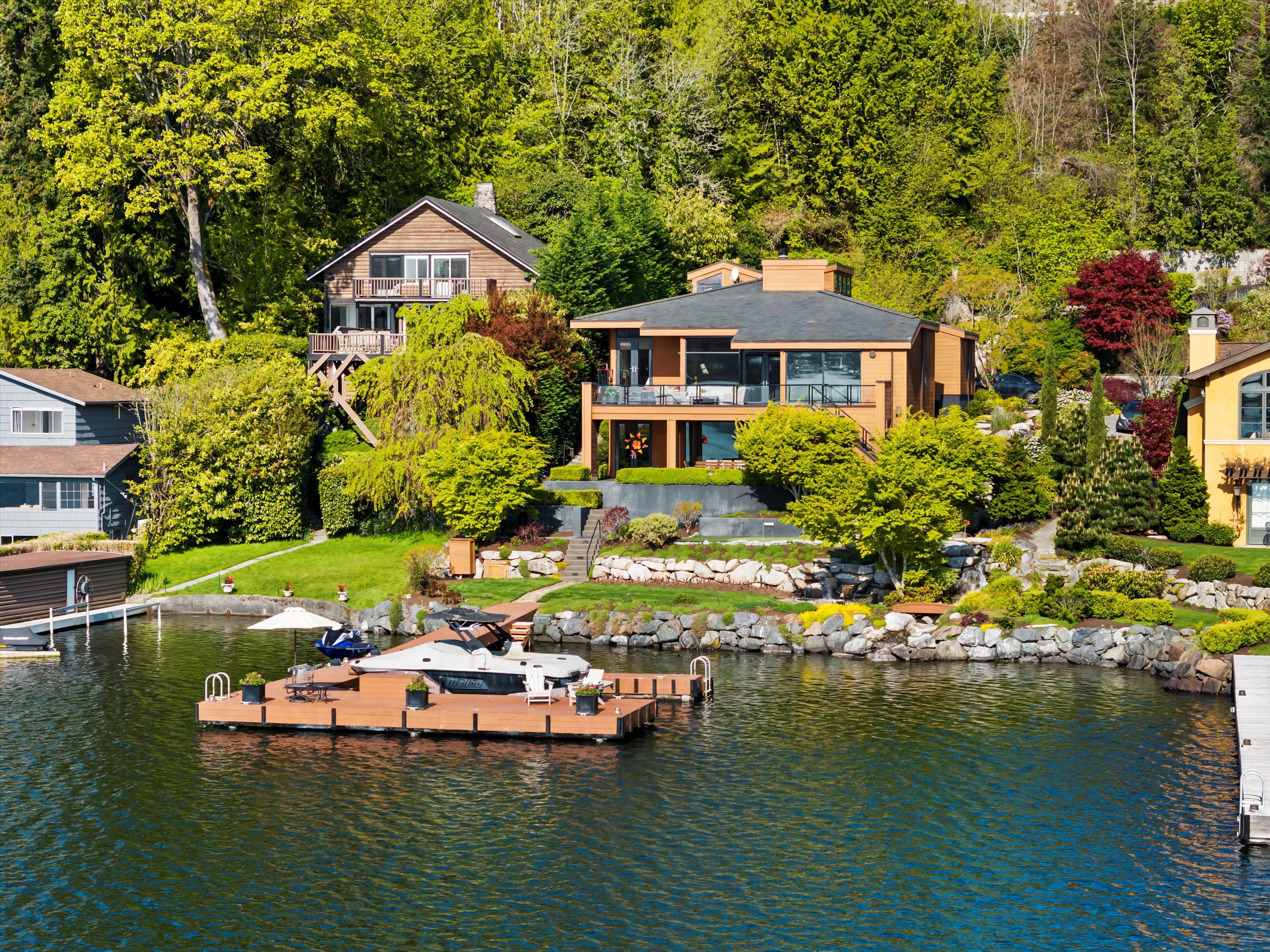 Exceptional Meydenbauer Bay south-facing waterfront work of art! Captivating views of Mt Rainier, Bellevue & the glistening waters of Lk WA. Architectural masterpiece w/cedar ceilings, walls of windows & open, light-filled floorplan. 5,580SF w/5BRs & 4BAs & view deck perfect for entertaining. Chef’s island kitchen open to living areas - all w/ exceptional lake views. Primary w/deck & spa. 2nd kitchen, wine cellar, sauna, work/flex rm & patio w/built-in BBQ. Lush grounds w/incredible waterfall, lakeside firepit & putting green. 87’ dock w/multiple lifts. A+ location 2 mins to downtown Bellevue, parks & top rated schools. Curated for effortless living & unforgettable moments, a truly extraordinary retreat where waterfront dreams are realized!