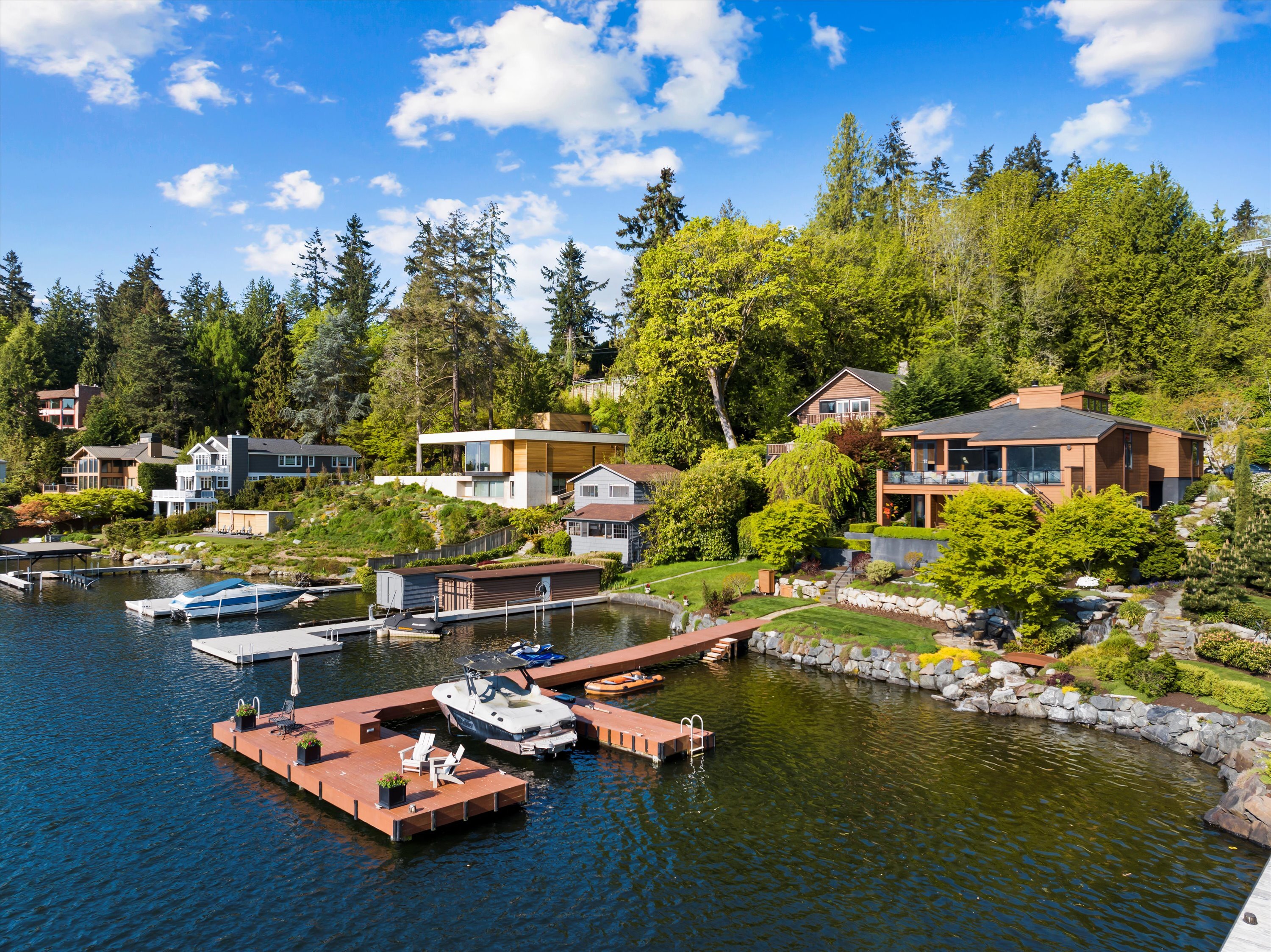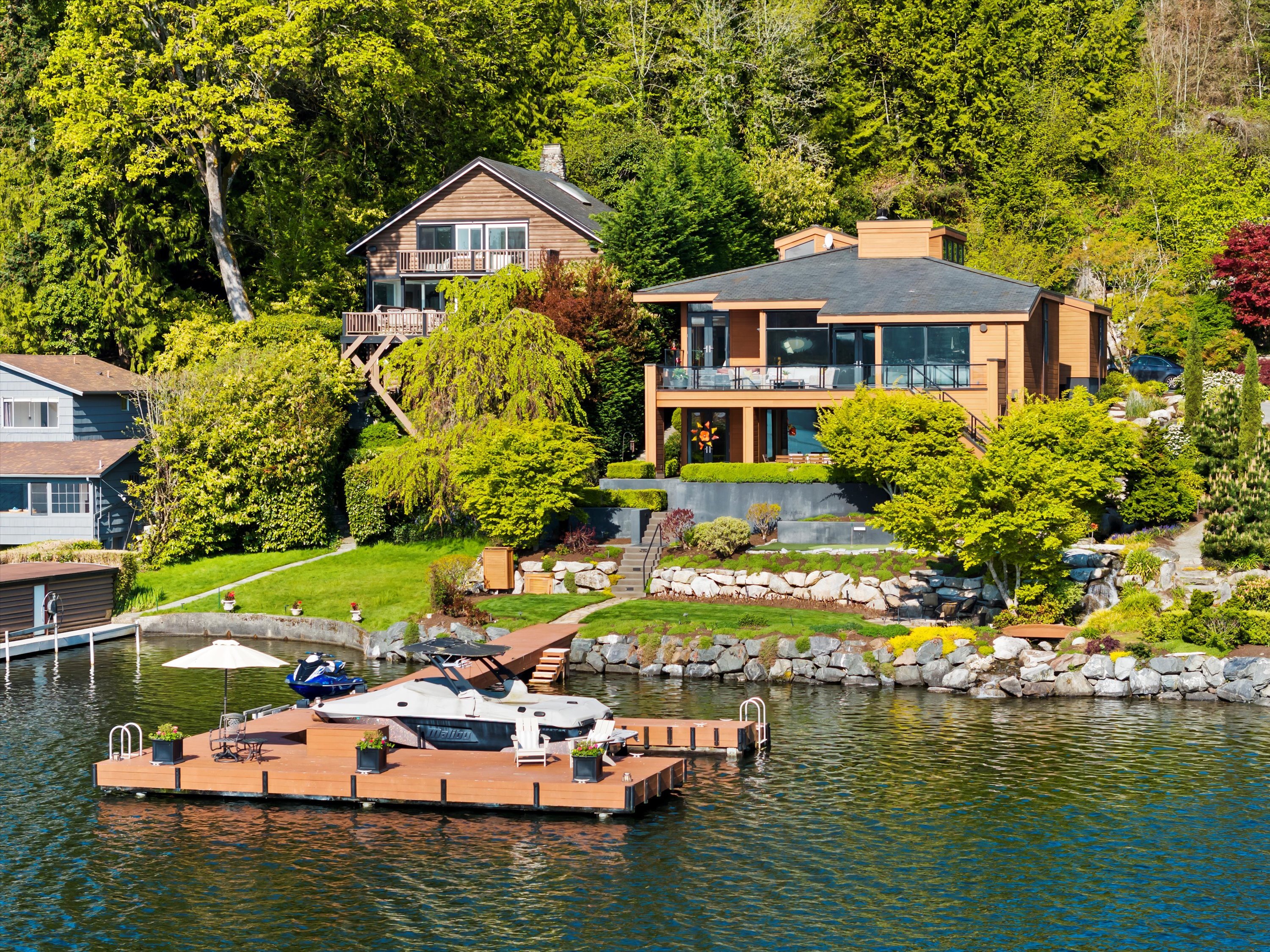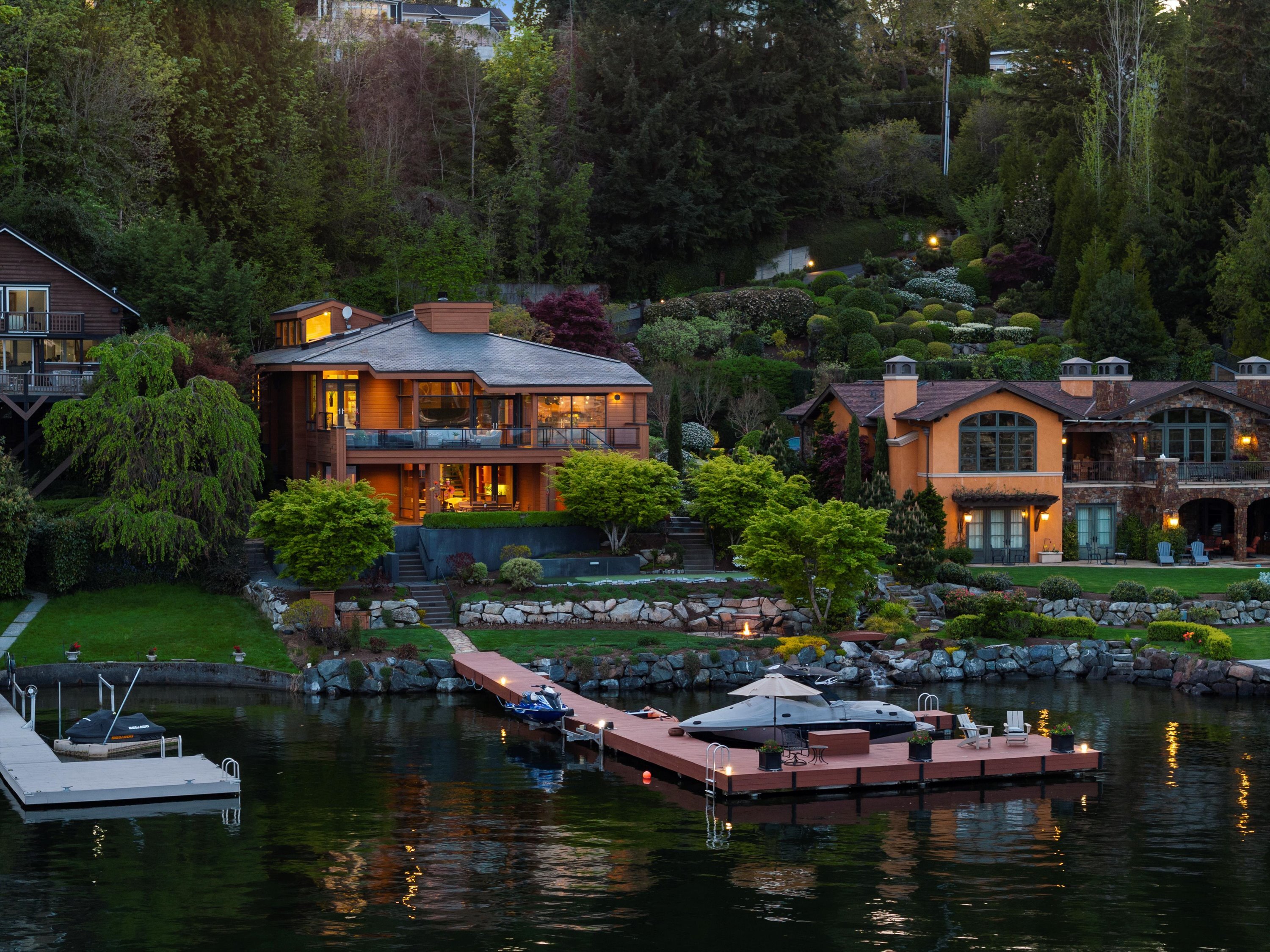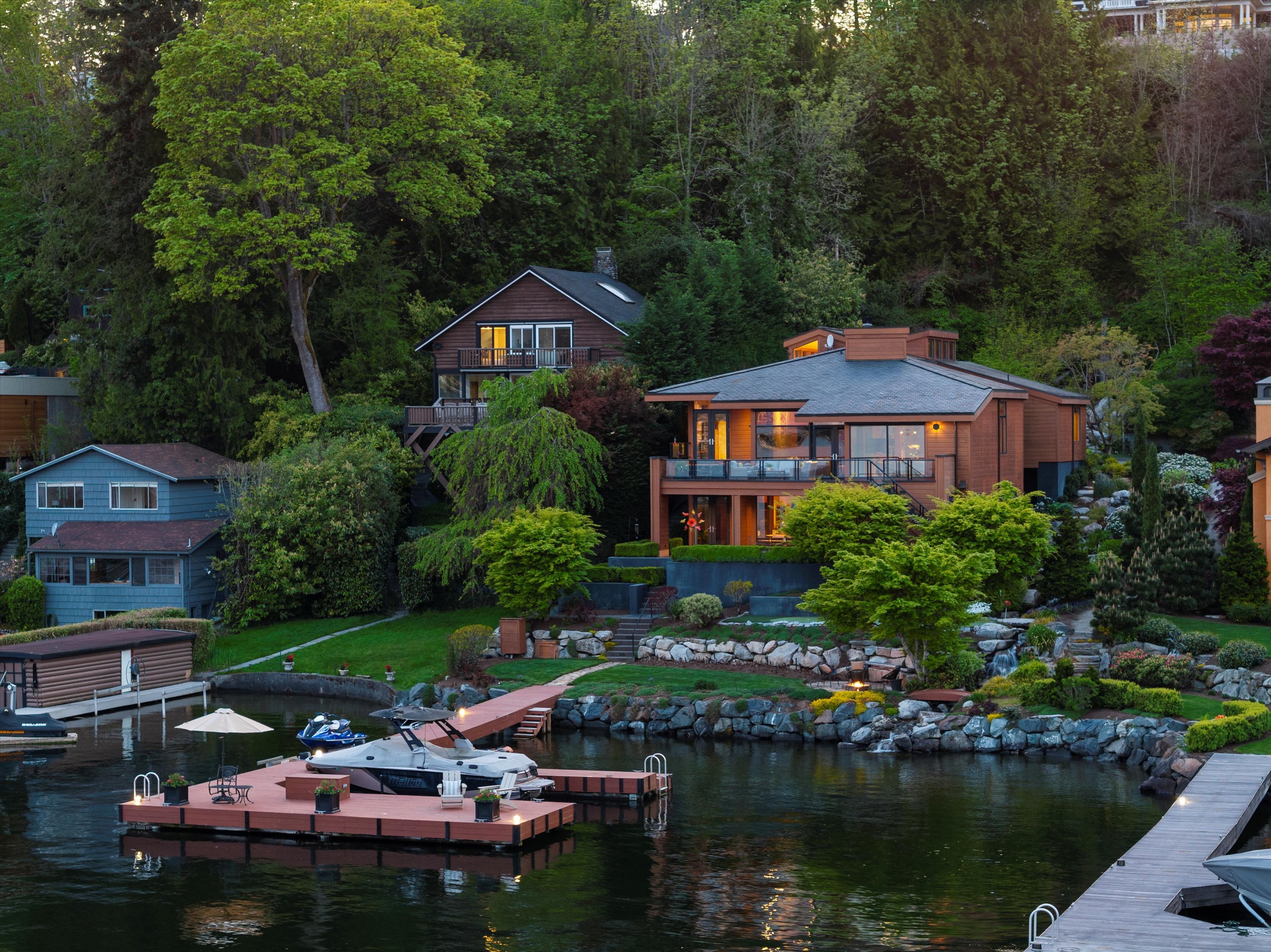 Exceptional Meydenbauer Bay south-facing waterfront work of art! Captivating views of Mt Rainier, Bellevue & the glistening waters of Lk WA. Architectural masterpiece w/cedar ceilings, walls of windows & open, light-filled floorplan. 5,580SF w/5BRs & 4BAs & view deck perfect for entertaining. Chef’s island kitchen open to living areas - all w/ exceptional lake views. Primary w/deck & spa. 2nd kitchen, wine cellar, sauna, work/flex rm & patio w/built-in BBQ. Lush grounds w/incredible waterfall, lakeside firepit & putting green. 87’ dock w/multiple lifts. A+ location 2 mins to downtown Bellevue, parks & top rated schools. Curated for effortless living & unforgettable moments, a truly extraordinary retreat where waterfront dreams are realized!