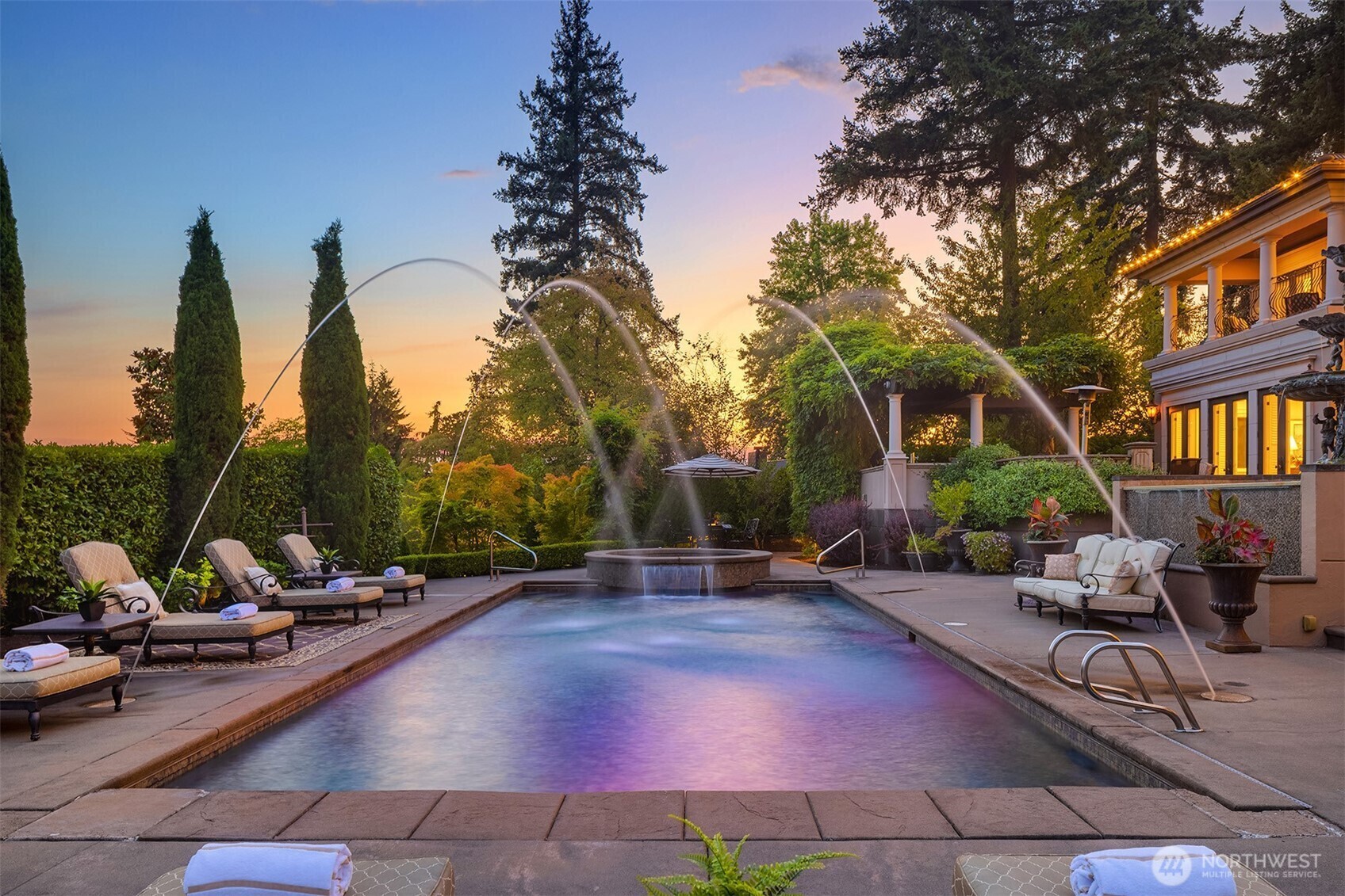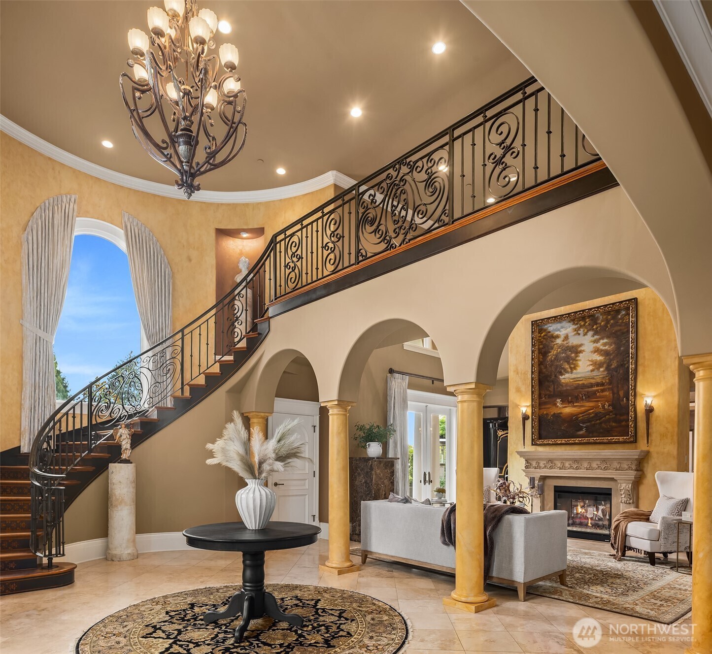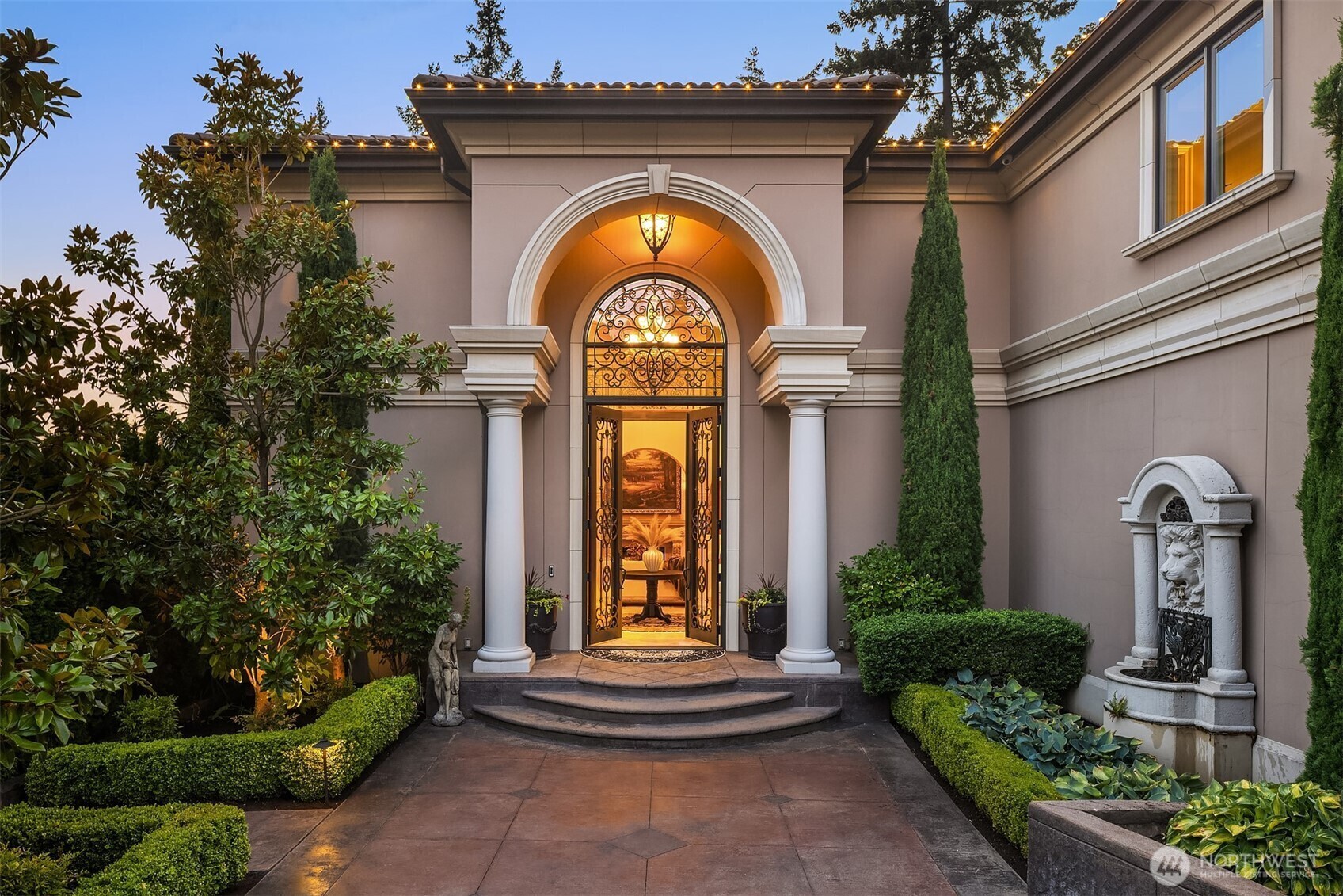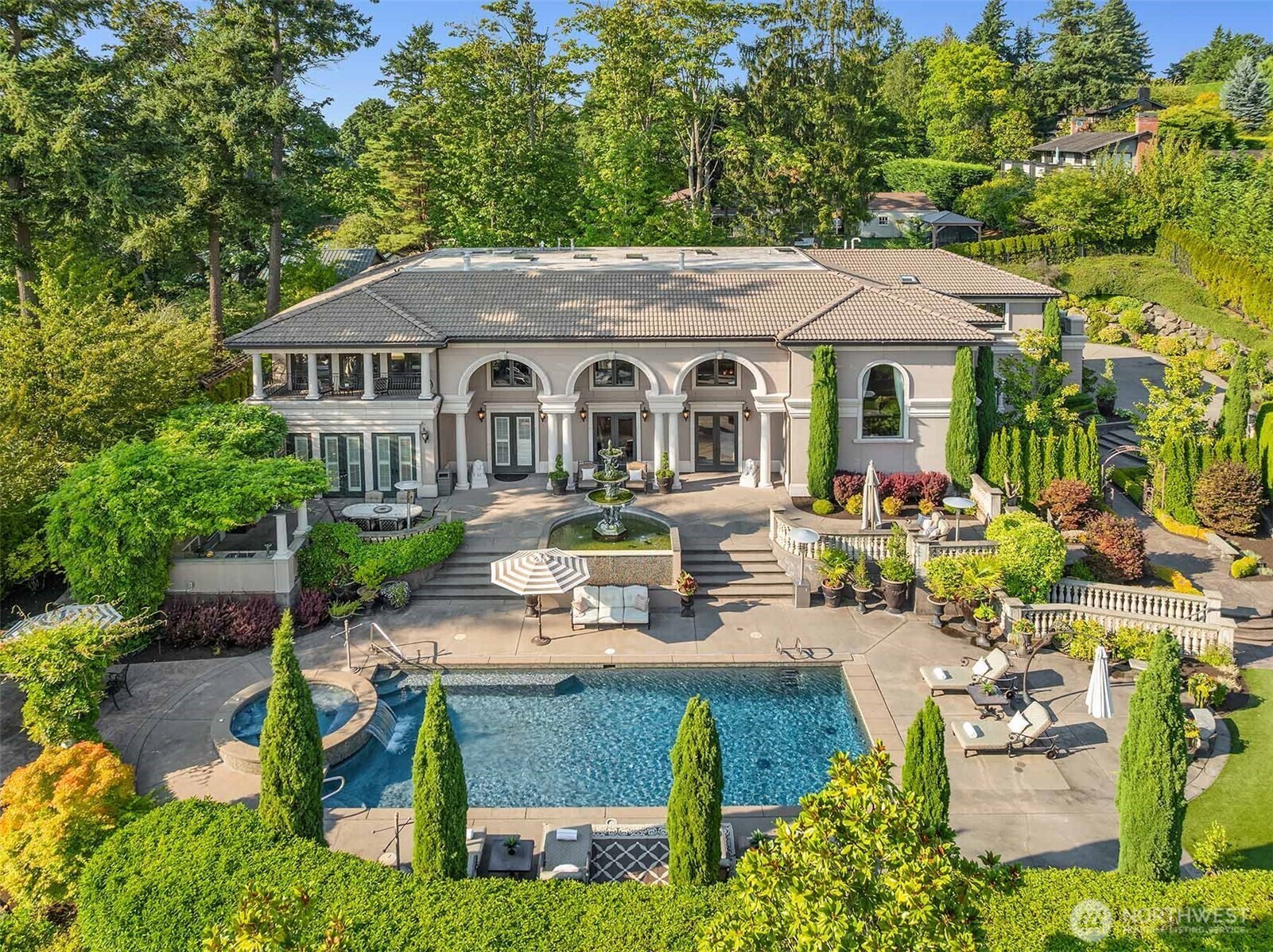 Drawing inspiration from timeless villas of Tuscany, this extraordinary Clyde Hill estate is a masterful blend of European elegance and Pacific Northwest luxury. Privately gated on a manicured half-acre, the residence is thoughtfully designed for both grand-scale entertaining and refined everyday living. At the heart of the home, a gourmet kitchen showcases a massive granite island, rich custom cabinetry, and luxury-grade appliances, all framed by a striking wall of French doors that seamlessly connect indoor living to an expansive outdoor kitchen and dining terrace. The open-concept design invites effortless entertaining, while refined architectural details elevate every space. The residence offers five generously sized bedrooms, each with a private en-suite bath, ensuring comfort and privacy for family and guests. The primary suite is a sanctuary, featuring a serene balcony overlooking the resort-style pool, a two-way gas fireplace, steam shower, and two custom-designed closets. Additional spaces include formal dining, wine parlor, two private offices, game room, and gym, providing versatility for work, leisure, and relaxation. Outdoors, a Mediterranean-inspired oasis awaits, complete with resort-style pool and spa, firepit, and sun-drenched terraces, creating an unparalleled setting for entertaining or tranquil retreat. This Tuscan-inspired estate offers rare privacy, timeless design, and an exceptional lifestyle in one of the Eastside’s most coveted neighborhoods.