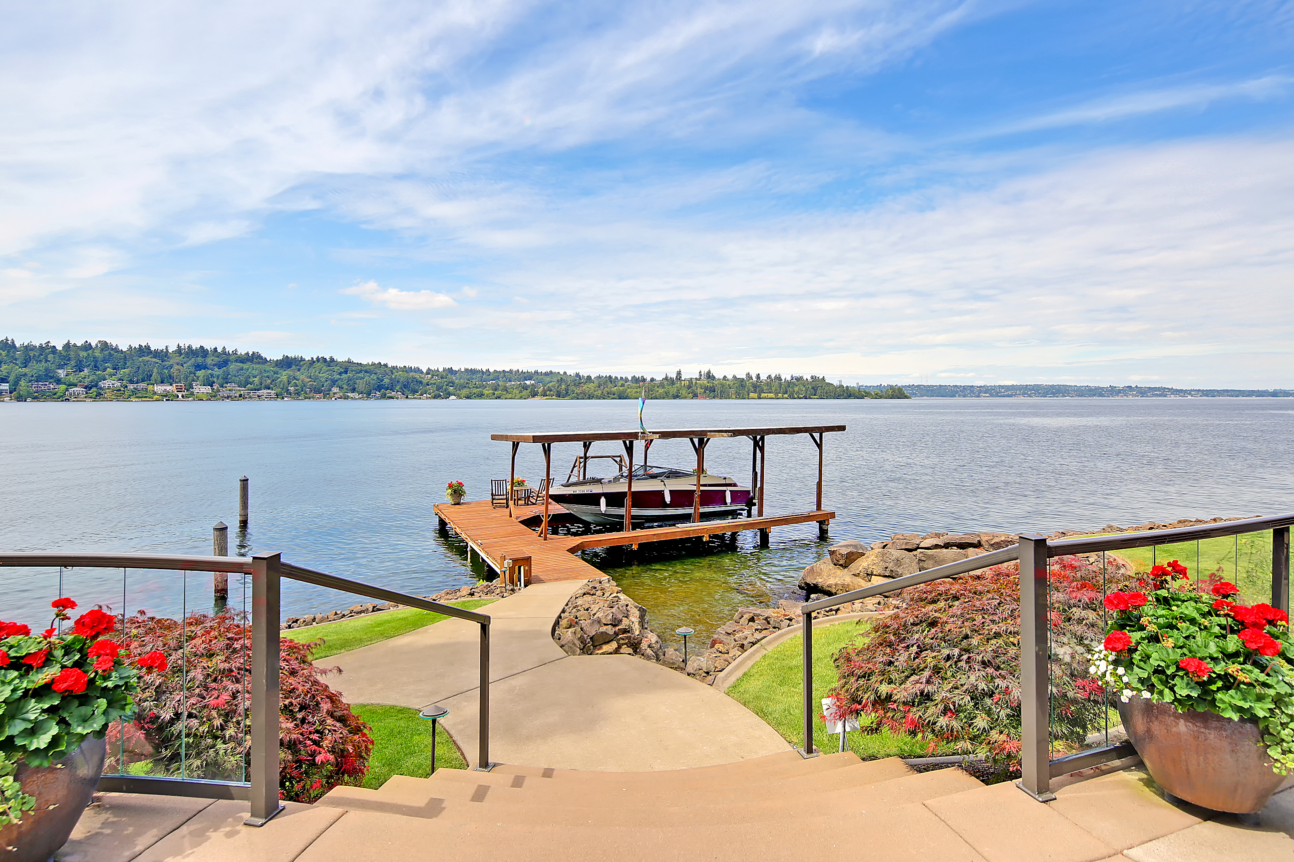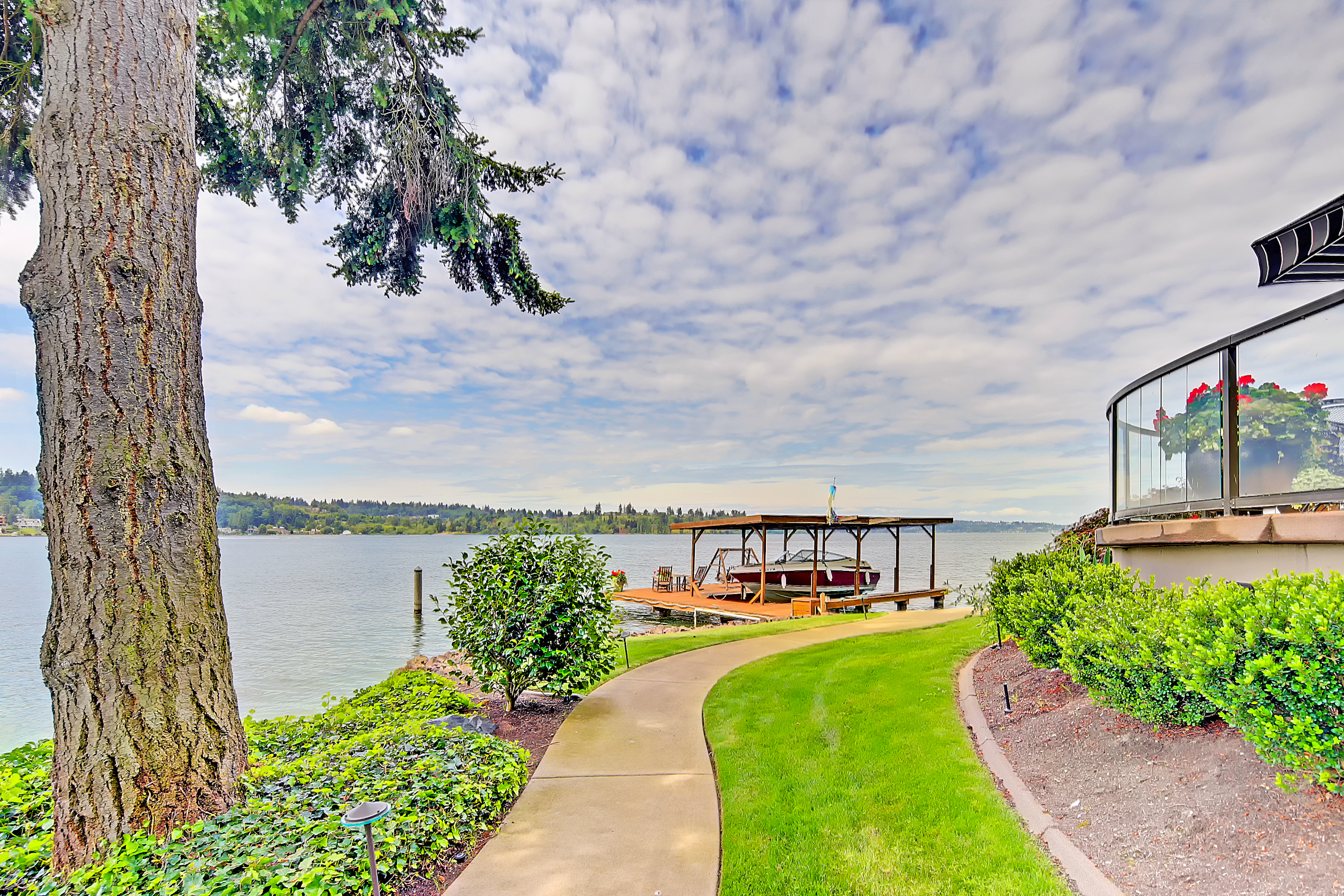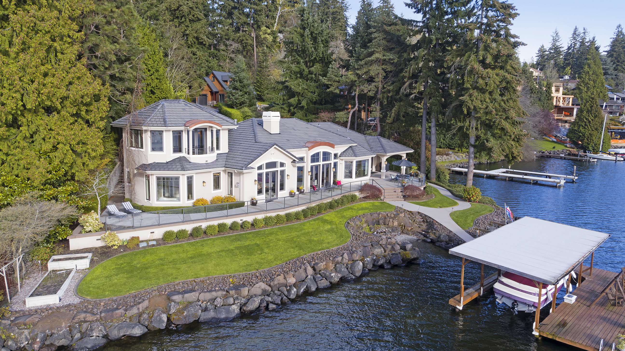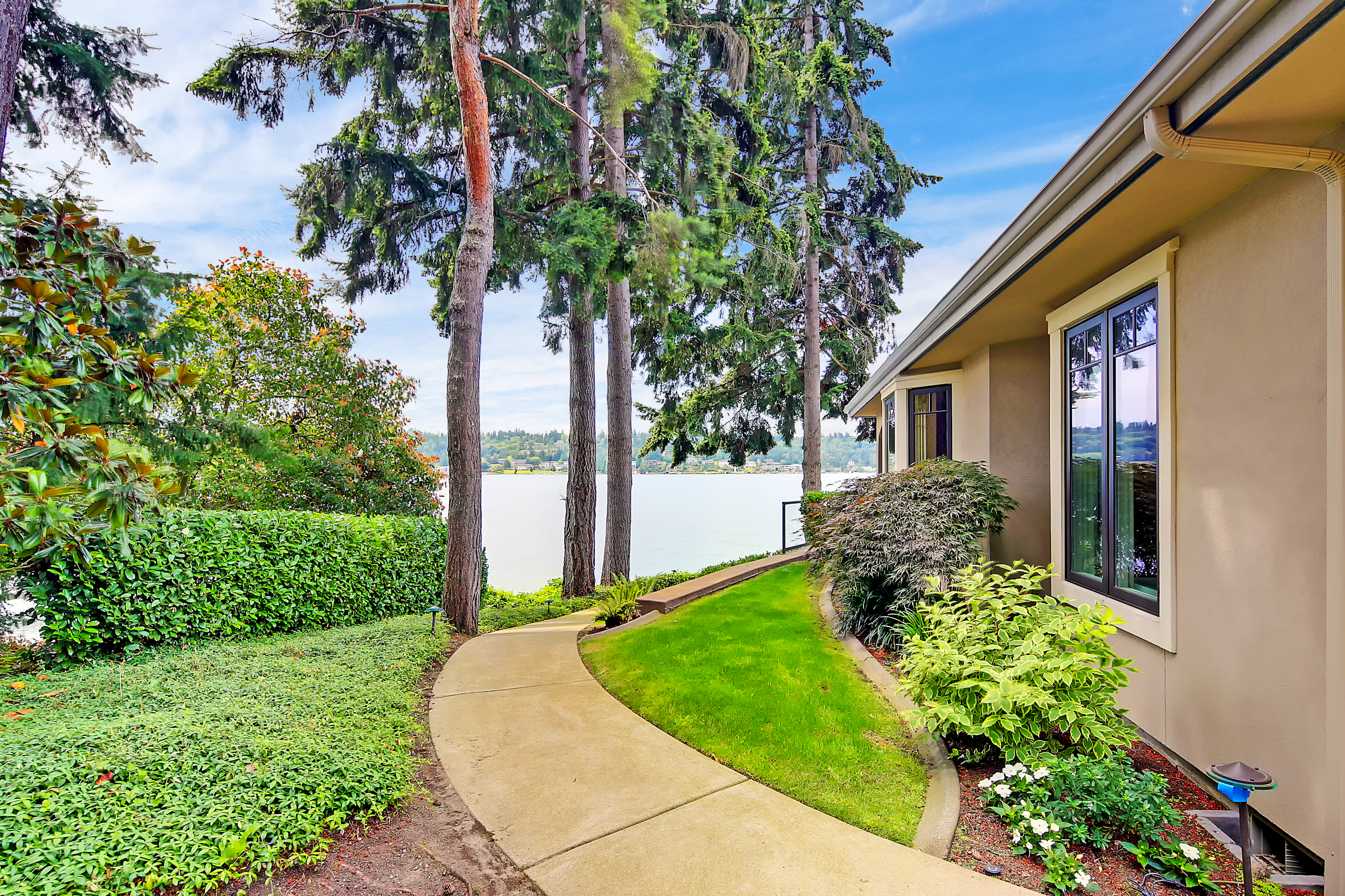 Stunning custom estate on the water's edge. 150+/- ft. of tranquil frontage w/private peninsula offers westerly views to Luther Burbank Park and Olympics. Sun-drenched great room w/French doors from living space to lake fun. Two main level master retreats. Commercial-grade kitchen, 13 ft. ceilings in great room, walnut floors, wine room, upper activity room and guest suite. Monier tile roof. 15kw hardwired generator. Idyllic location far from the bridges and close-in for a secluded lifestyle.