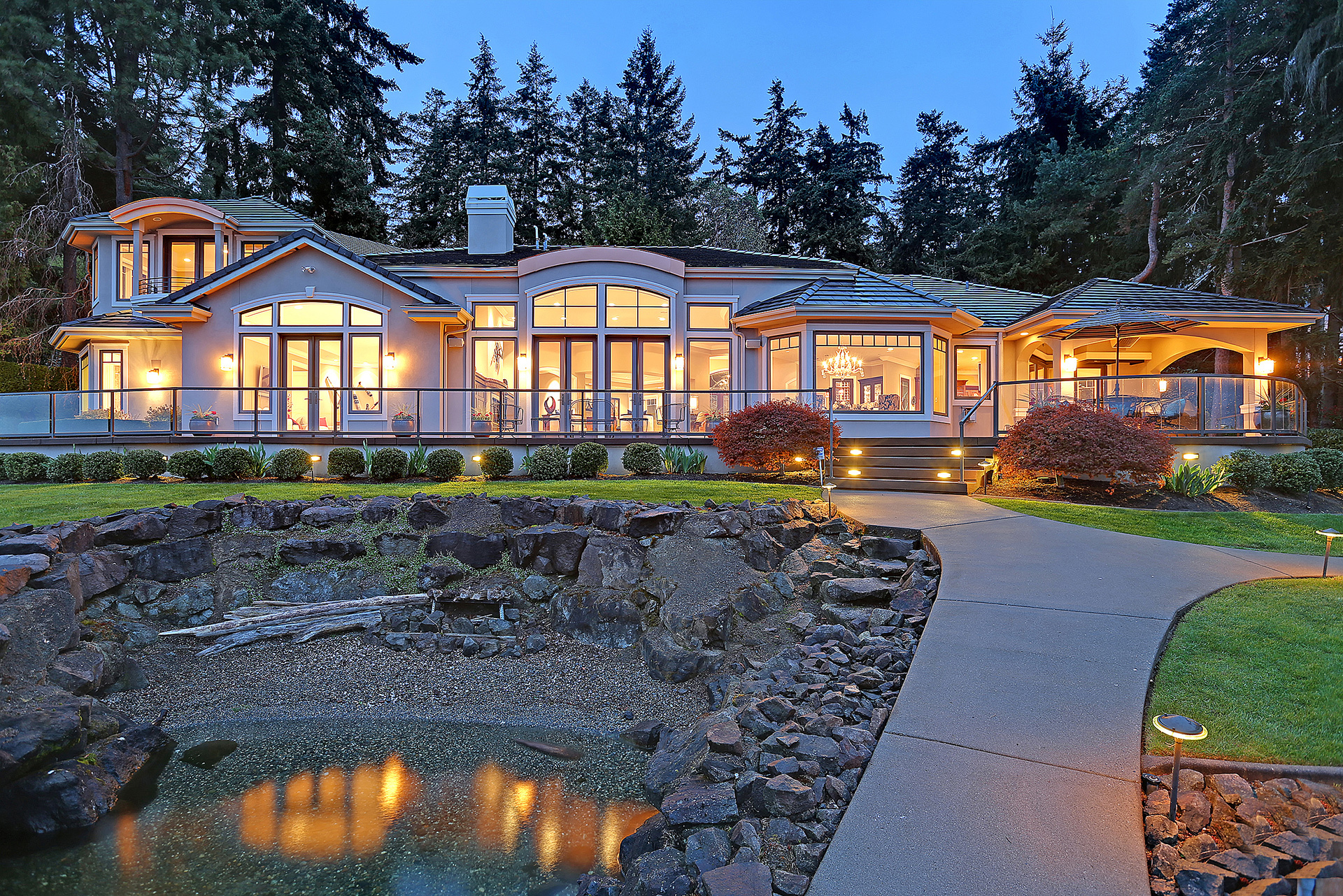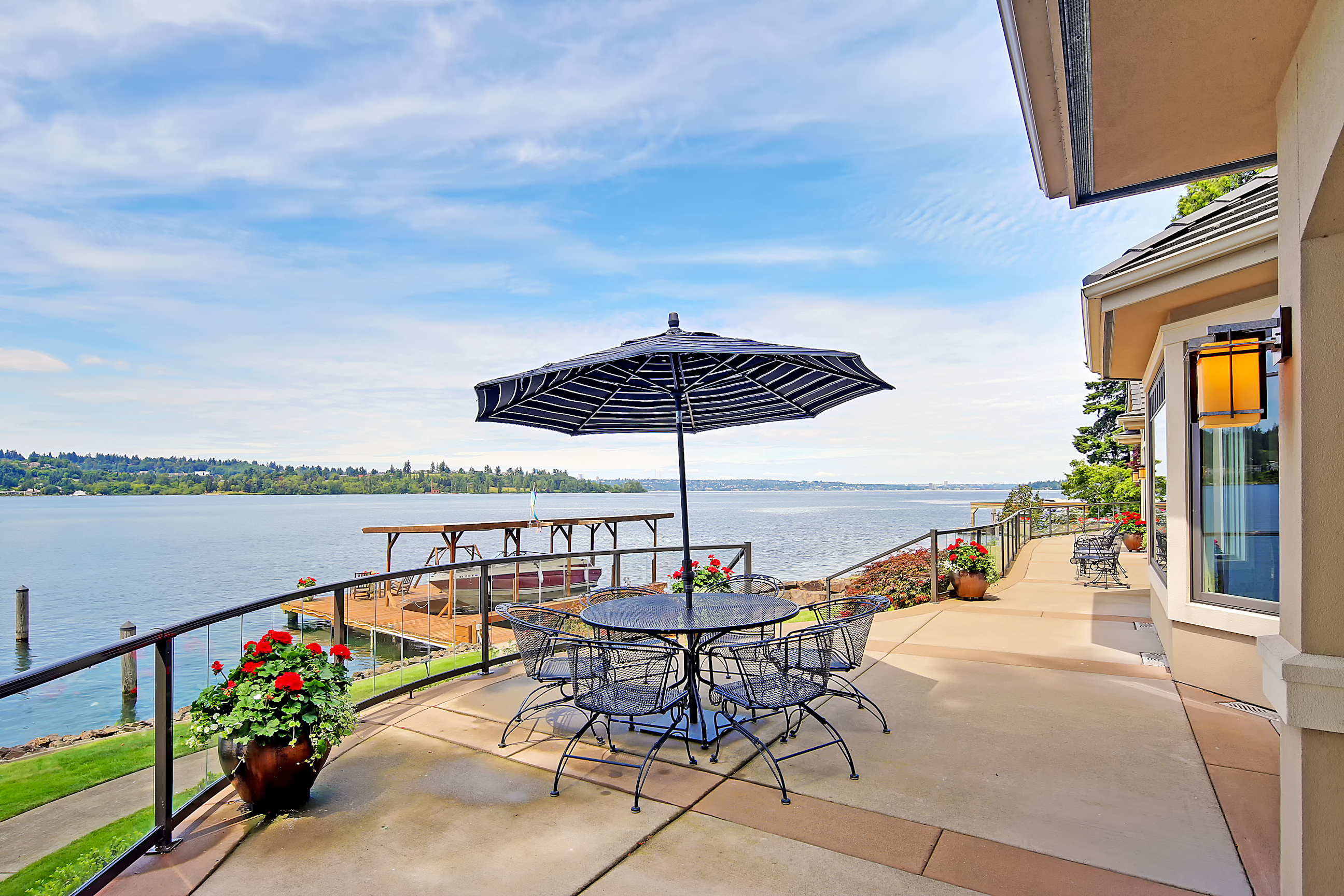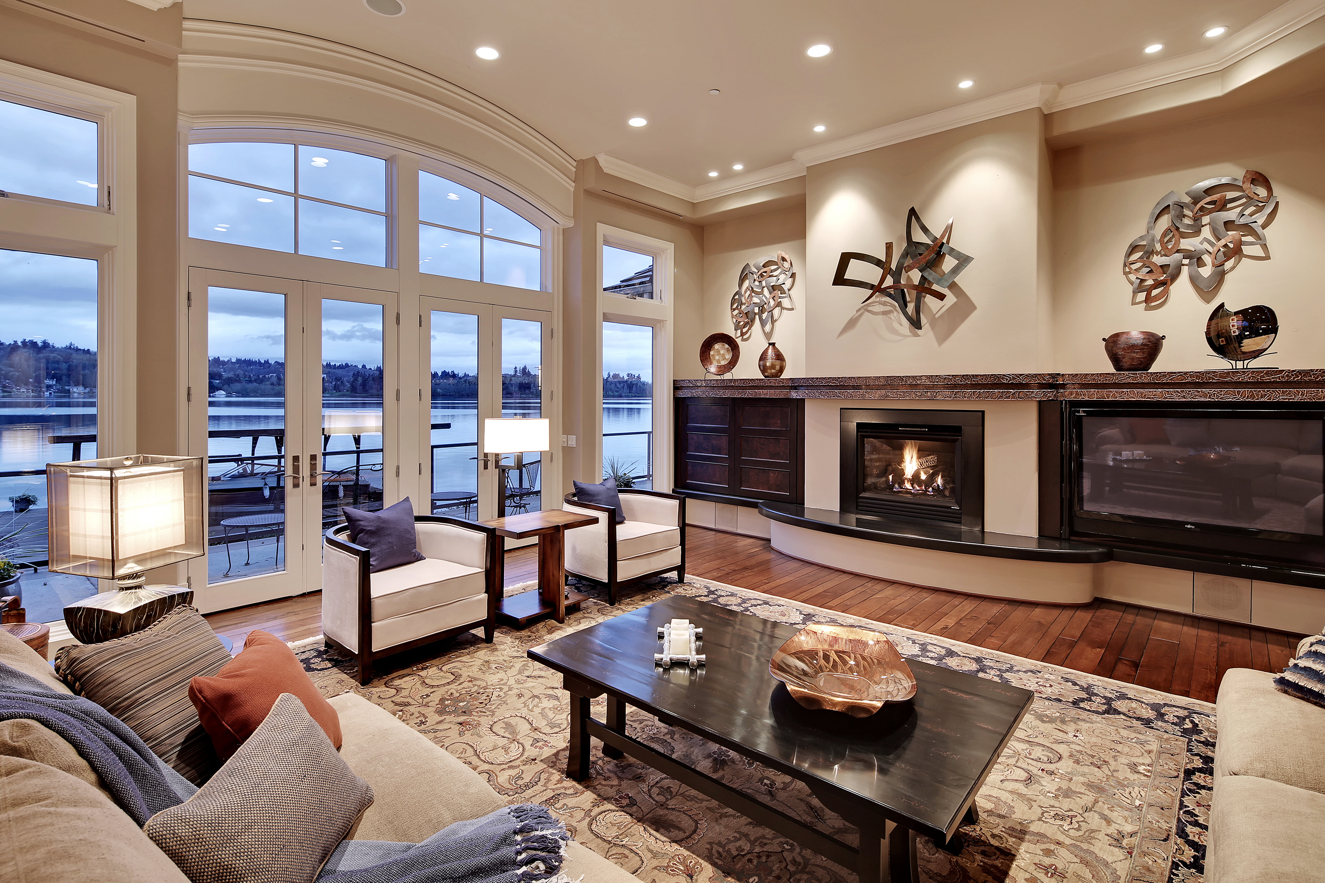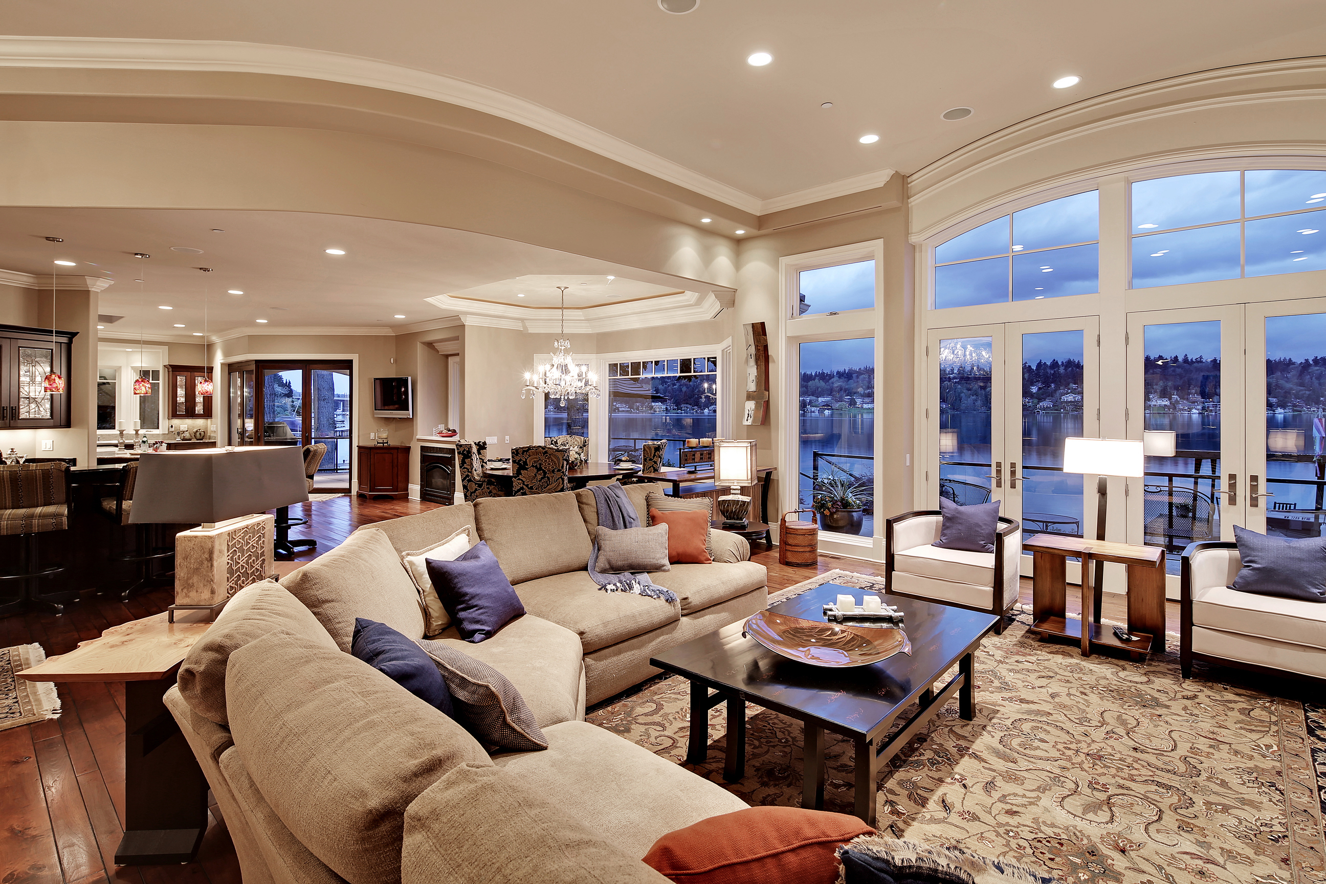 Stunning custom estate on the water's edge. 150+/- ft. of tranquil frontage w/private peninsula offers westerly views to Luther Burbank Park and Olympics. Sun-drenched great room w/French doors from living space to lake fun. Two main level master retreats. Commercial-grade kitchen, 13 ft. ceilings in great room, walnut floors, wine room, upper activity room and guest suite. Monier tile roof. 15kw hardwired generator. Idyllic location far from the bridges and close-in for a secluded lifestyle.