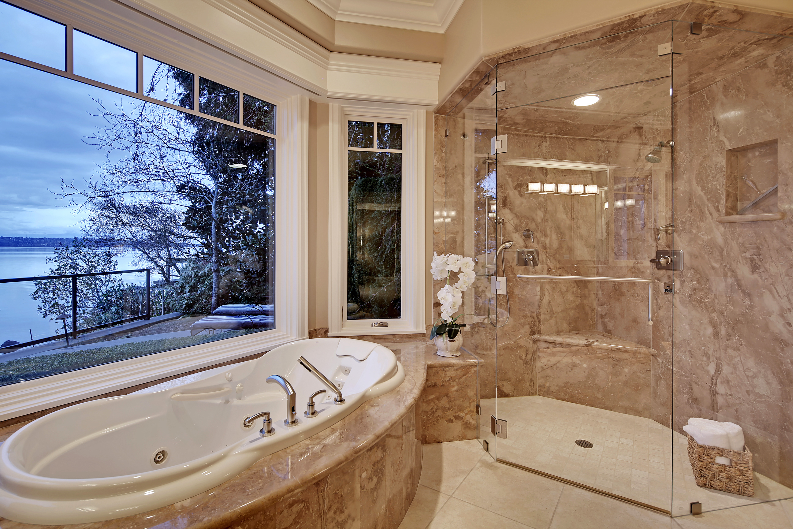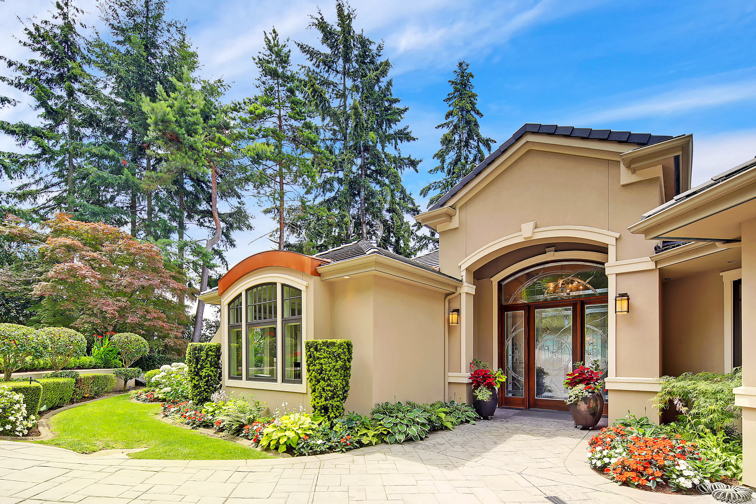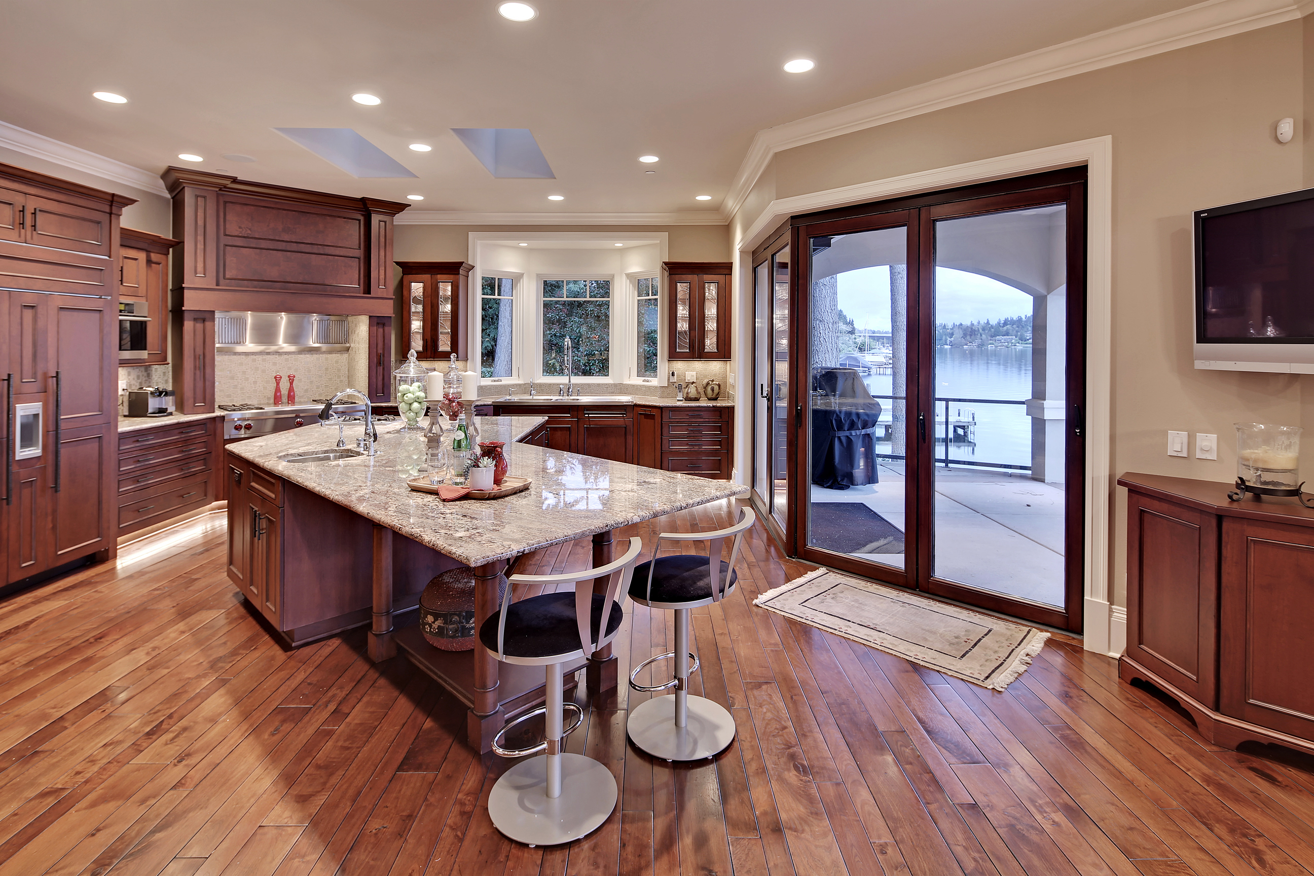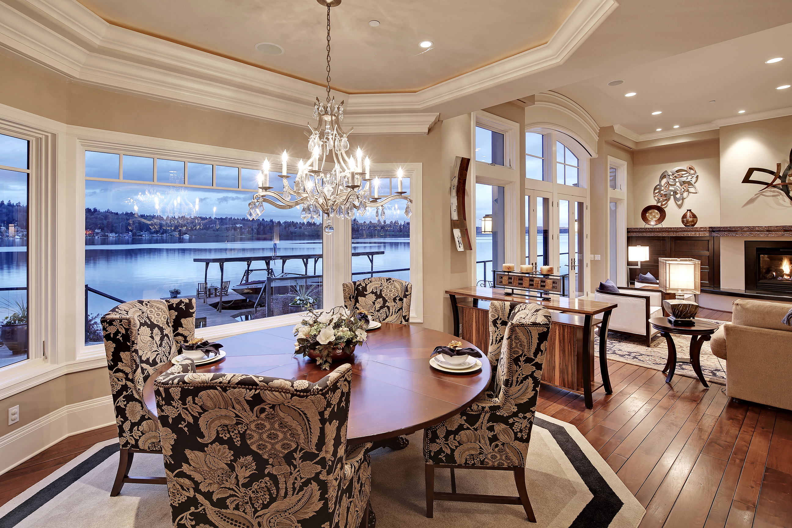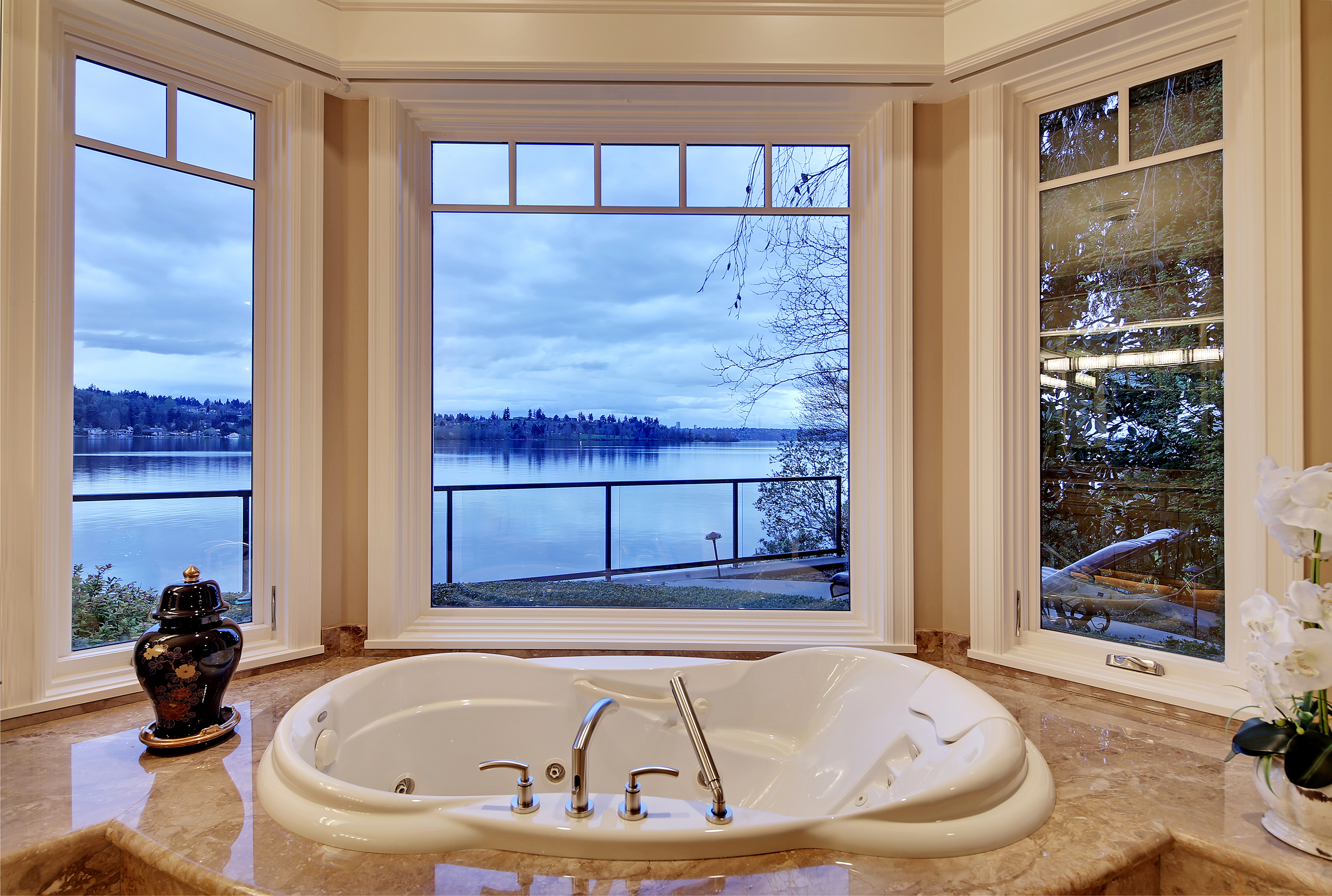 Stunning custom estate on the water's edge. 150+/- ft. of tranquil frontage w/private peninsula offers westerly views to Luther Burbank Park and Olympics. Sun-drenched great room w/French doors from living space to lake fun. Two main level master retreats. Commercial-grade kitchen, 13 ft. ceilings in great room, walnut floors, wine room, upper activity room and guest suite. Monier tile roof. 15kw hardwired generator. Idyllic location far from the bridges and close-in for a secluded lifestyle.