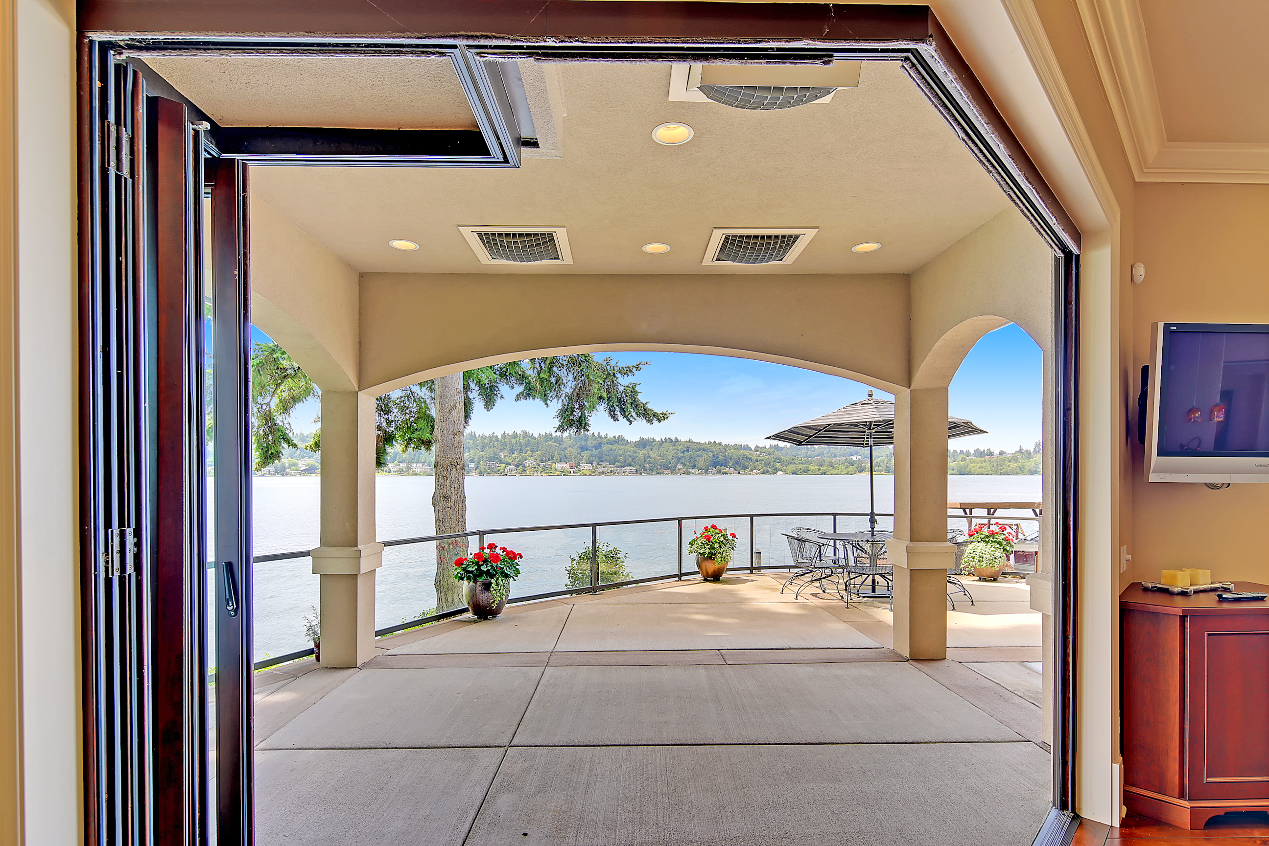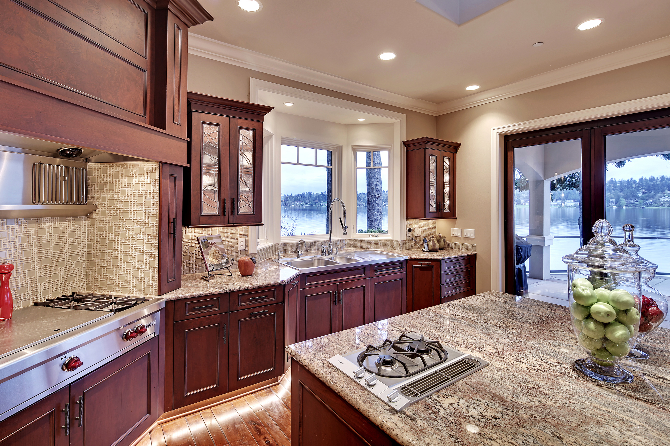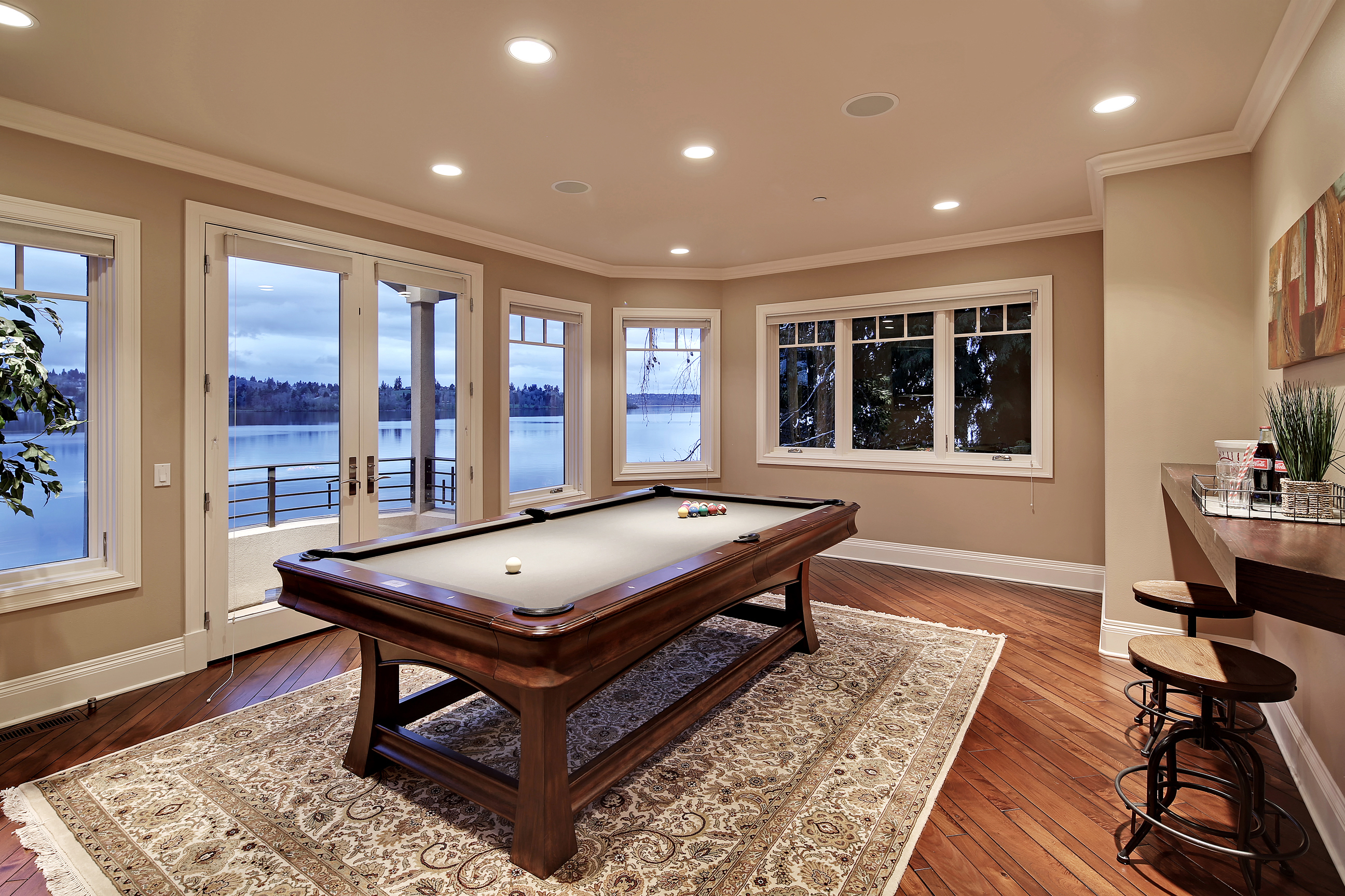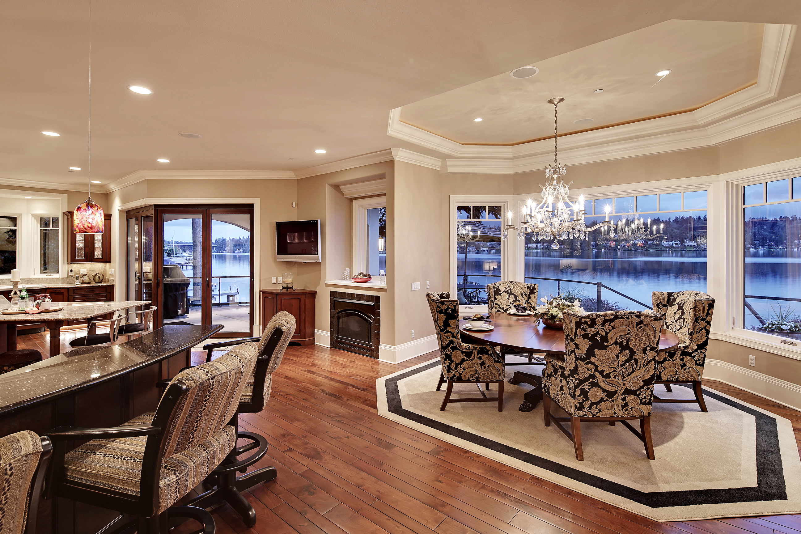 Stunning custom estate on the water's edge. 150+/- ft. of tranquil frontage w/private peninsula offers westerly views to Luther Burbank Park and Olympics. Sun-drenched great room w/French doors from living space to lake fun. Two main level master retreats. Commercial-grade kitchen, 13 ft. ceilings in great room, walnut floors, wine room, upper activity room and guest suite. Monier tile roof. 15kw hardwired generator. Idyllic location far from the bridges and close-in for a secluded lifestyle.